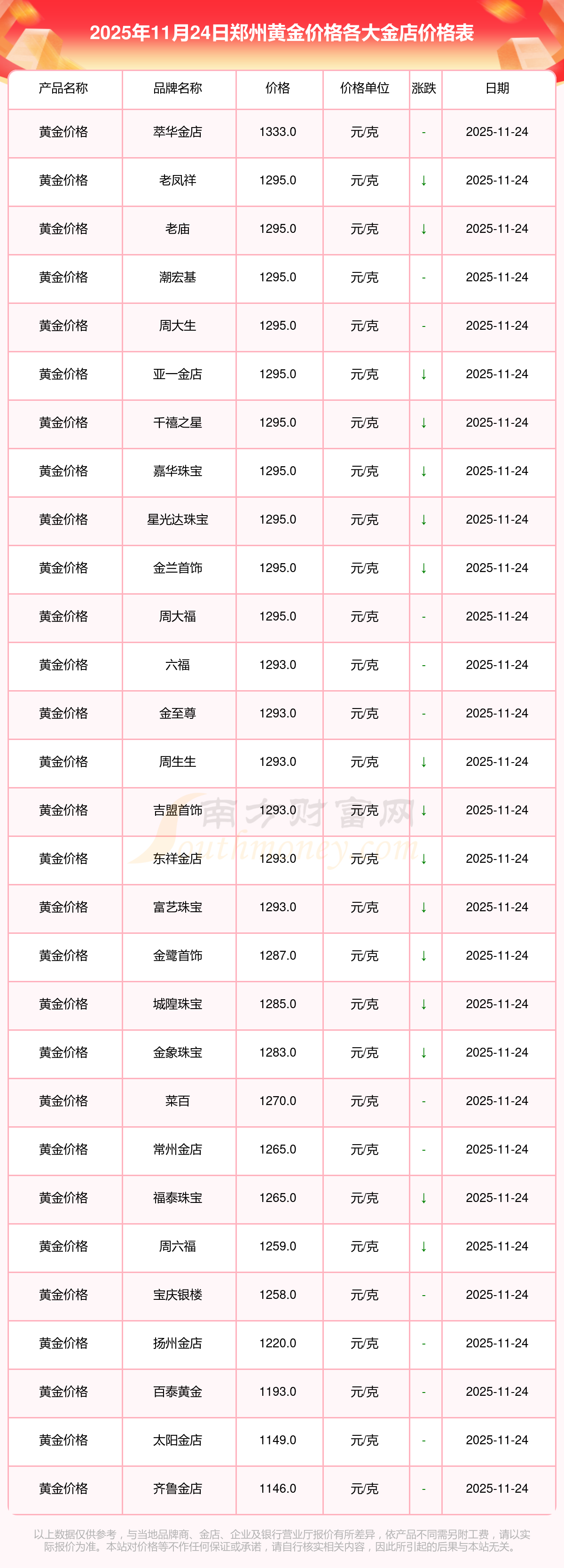 2025年11月24日,鄭州周大福、周大福、周大福、老鳳祥、老鳳祥、老鳳祥、周六福、周六福、周六福、周六福、六福等各大金店品牌黃金價格今日價格如下:周大福17630.0、周大福40570.0、周大福1134.0元/克、老鳳祥1295.0元/克、老鳳祥600.0元/克、老鳳祥1295.0元/克、周六福1259.0元/克、周六福590.0元/克、周六福590.0元/克、周六福1154.0元/克、六福1293.0元/克。