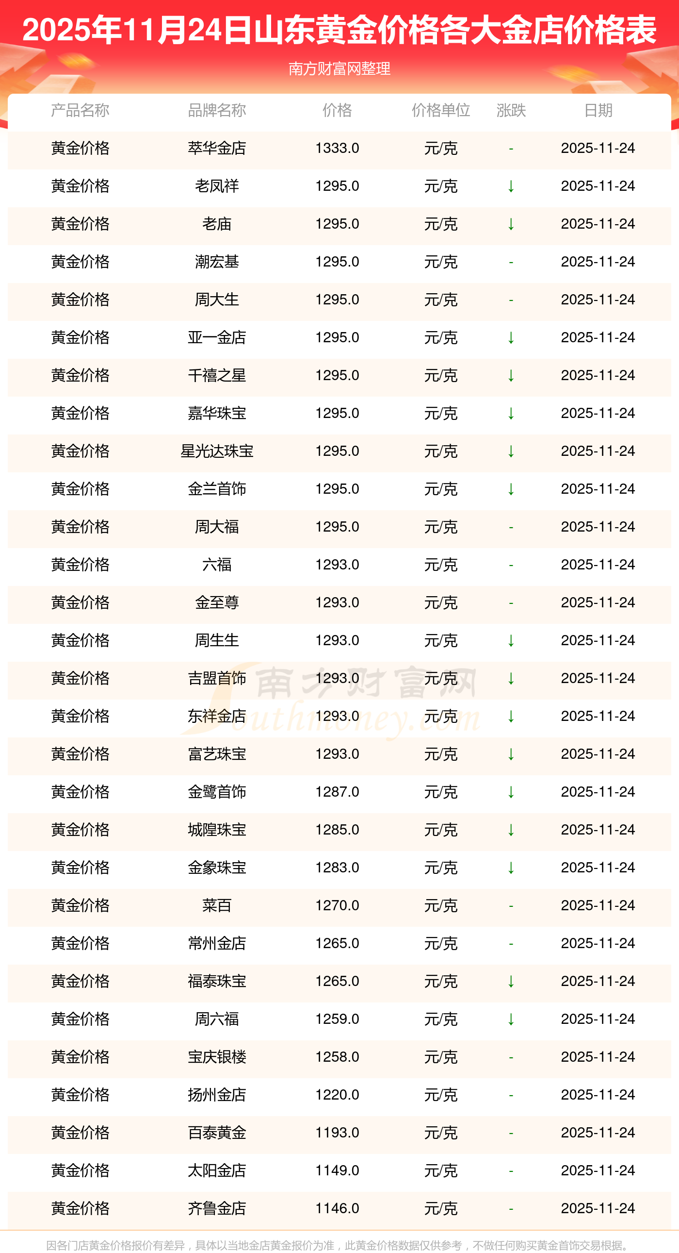 2025年11月24日,山東周大福、周大福、周大福、老鳳祥、老鳳祥、老鳳祥、周六福、周六福、周六福、周六福、六福等各大金店品牌黃金價(jià)格今日價(jià)格行情最新來了:周大福17630.0、周大福40570.0、周大福1134.0元/克、老鳳祥1295.0元/克、老鳳祥600.0元/克、老鳳祥1295.0元/克、周六福1259.0元/克、周六福590.0元/克、周六福590.0元/克、周六福1154.0元/克、六福1293.0元/克。