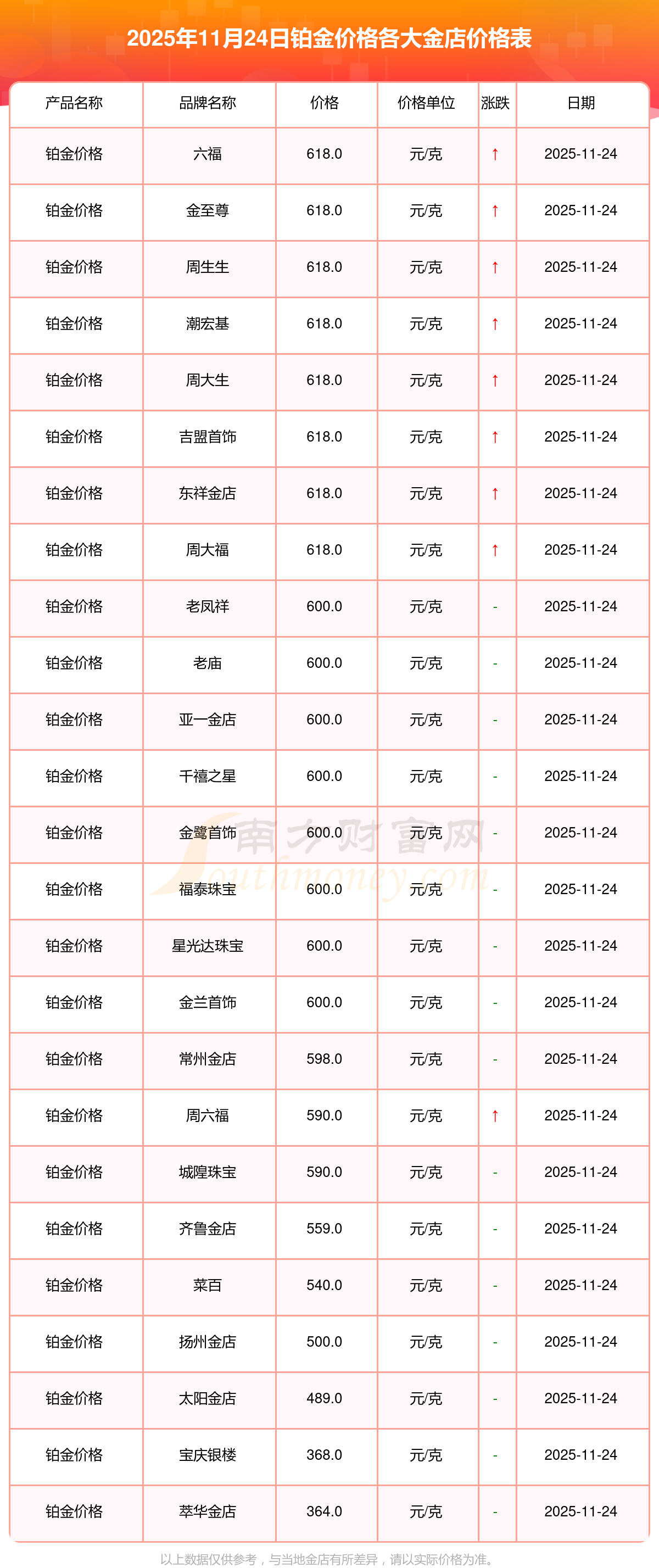 2025年11月24日周大福、周大福、周大福、老鳳祥、老鳳祥、老鳳祥、周六福、周六福、周六福、周六福、六福等各大金店品牌鉑金價格最新價格如下:周大福鉑金價格(香港)17630.0,周大福金條價格(香港)40570.0,周大福金條金價(內(nèi)地)1134.0元/克,老鳳祥黃金價格1295.0元/克,老鳳祥鉑金價格600.0元/克,老鳳祥足金價格1295.0元/克,周六福黃金價格1259.0元/克,周六福鉑金價格590.0元/克,周六福PT999鉑金價格590.0元/克,周六福金條價格1154.0元/克,六福黃金價格1293.0元/克。