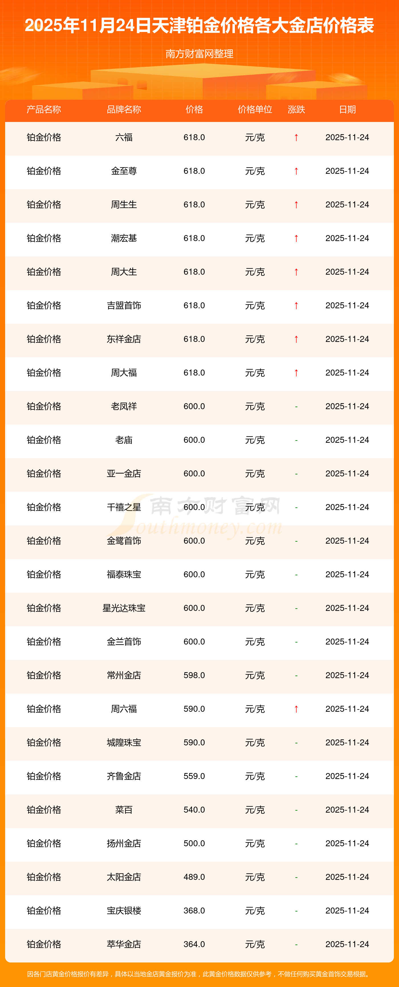 2025年11月24日天津各大金店鉑金價格最新價格:周大福17630.0,周大福40570.0,周大福1134.0元/克,老鳳祥1295.0元/克,老鳳祥600.0元/克,老鳳祥1295.0元/克,周六福1259.0元/克,周六福590.0元/克,周六福590.0元/克,周六福1154.0元/克,六福1293.0元/克。