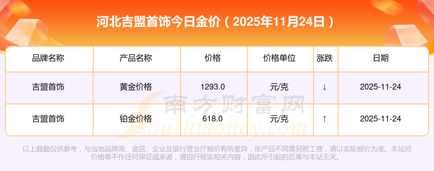 今日黃金價(jià)格查詢_現(xiàn)在金價(jià)黃金一克多少錢,黃金價(jià)格是多少錢一克?河北吉盟首飾金價(jià)今日價(jià)格:鉑金價(jià)格(香港)17630.0,金條價(jià)格(香港)40570.0,金條金價(jià)(內(nèi)地)1134.0元/克,黃金價(jià)格1295.0元/克,鉑金價(jià)格600.0元/克,足金價(jià)格1295.0元/克,黃金價(jià)格1259.0元/克,鉑金價(jià)格590.0元/克,PT999鉑金價(jià)格590.0元/克,金條價(jià)格1154.0元/克,黃金價(jià)格1293.0元/克。