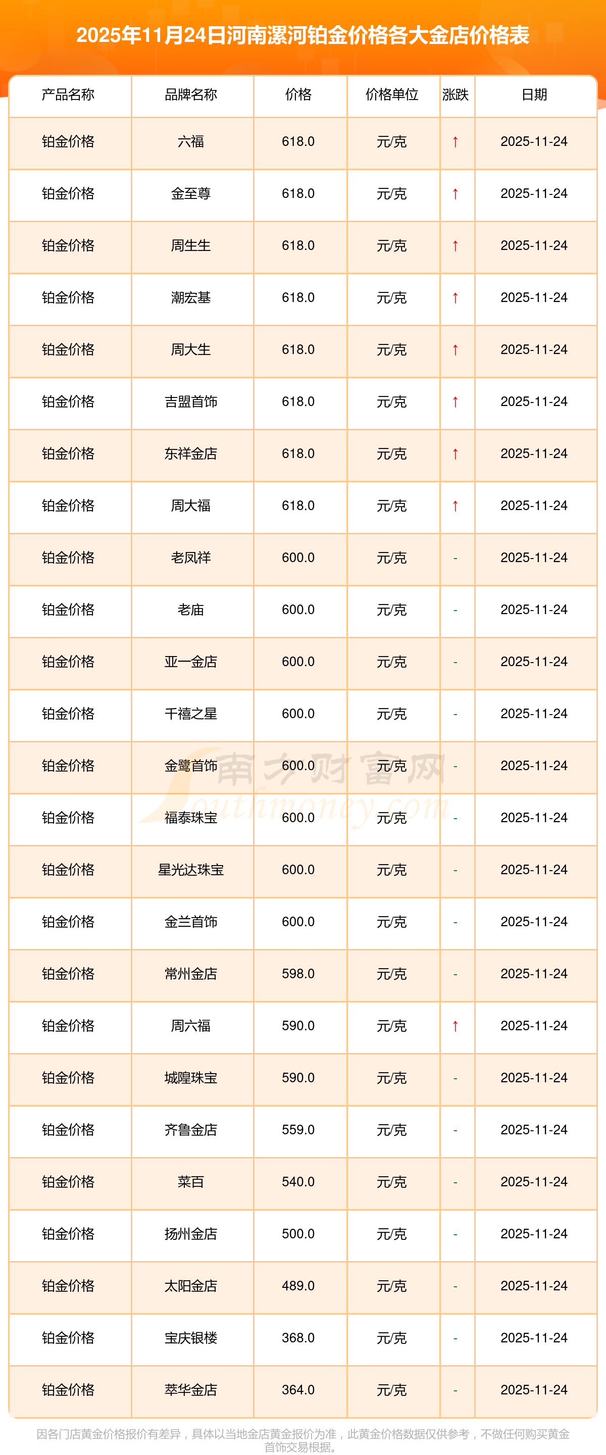 2025年11月24日河南漯河周大福、周大福、周大福、老鳳祥、老鳳祥、老鳳祥、周六福、周六福、周六福、周六福、六福等各大金店品牌鉑金價格最新價格如下:周大福鉑金價格(香港)17630.0,周大福金條價格(香港)40570.0,周大福金條金價(內地)1134.0元/克,老鳳祥黃金價格1295.0元/克,老鳳祥鉑金價格600.0元/克,老鳳祥足金價格1295.0元/克,周六福黃金價格1259.0元/克,周六福鉑金價格590.0元/克,周六福PT999鉑金價格590.0元/克,周六福金條價格1154.0元/克,六福黃金價格1293.0元/克。