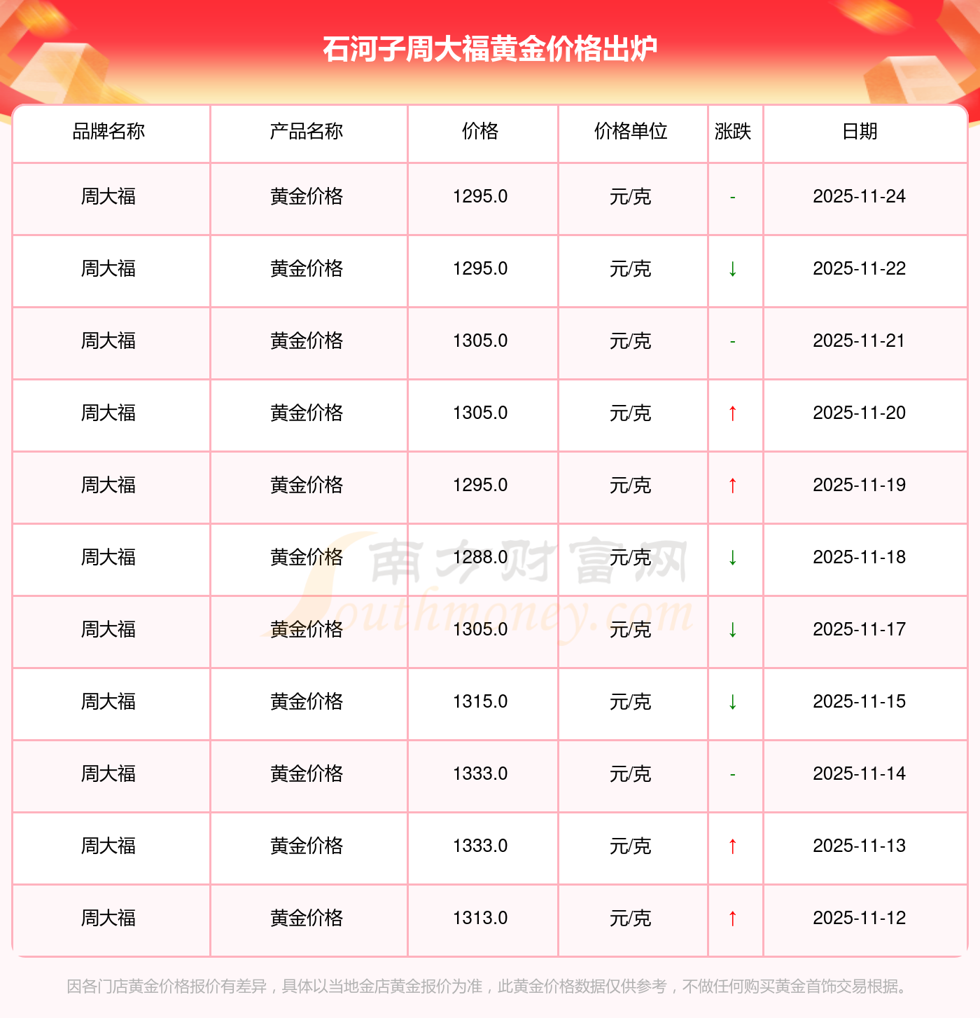 2025年11月24日,石河子周大福黃金價格每克的價值量定格在1295.0元/克。