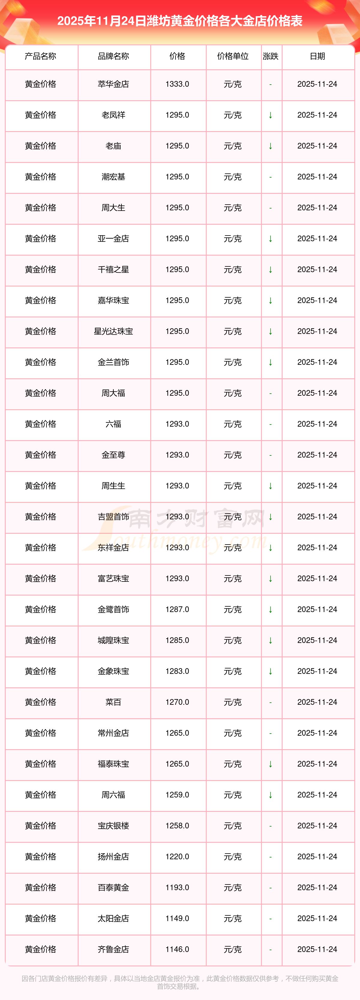 今天是2025年11月24日,濰坊周大福、周大福、周大福、老鳳祥、老鳳祥、老鳳祥、周六福、周六福、周六福、周六福、六福等各大金店品牌黃金價(jià)格最新價(jià)格行情是這樣的:周大福17630.0、周大福40570.0、周大福1134.0元/克、老鳳祥1295.0元/克、老鳳祥600.0元/克、老鳳祥1295.0元/克、周六福1259.0元/克、周六福590.0元/克、周六福590.0元/克、周六福1154.0元/克、六福1293.0元/克。