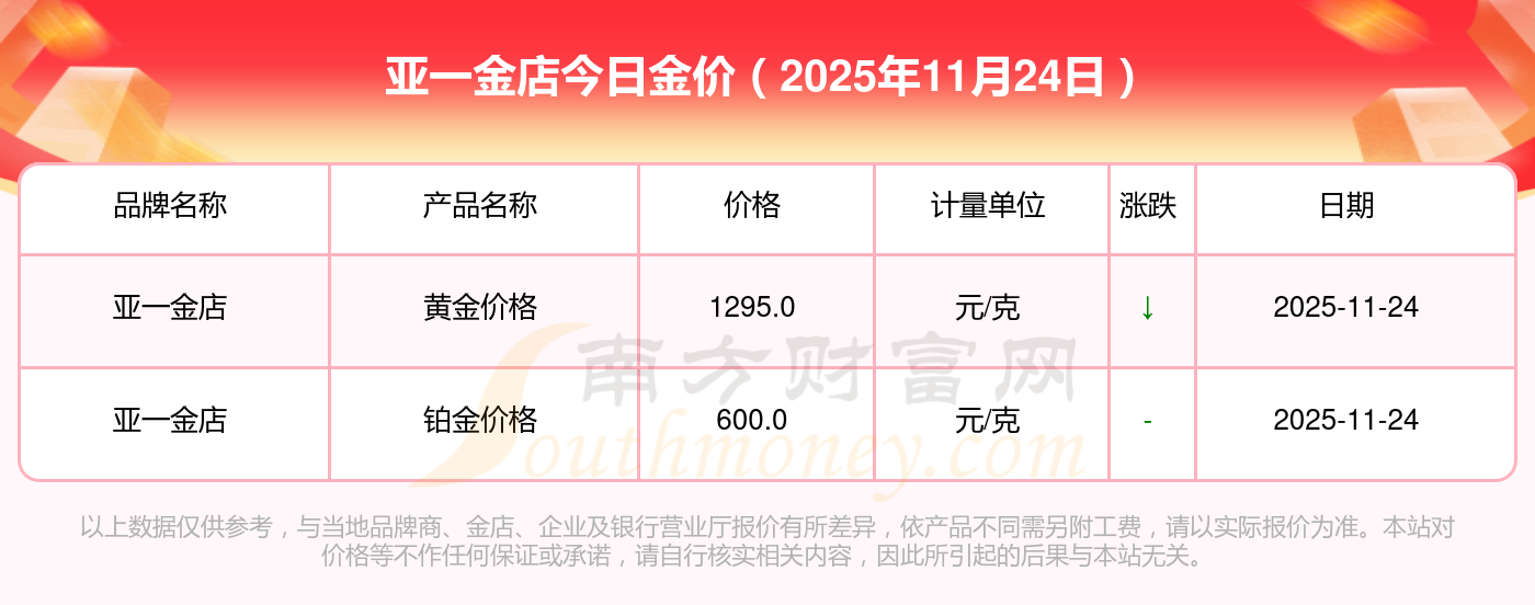 2025年11月24日亞一金店今日價格:鉑金價格(香港)17630.0,金條價格(香港)40570.0,金條金價(內(nèi)地)1134.0元/克,黃金價格1295.0元/克,鉑金價格600.0元/克,足金價格1295.0元/克,黃金價格1259.0元/克,鉑金價格590.0元/克,PT999鉑金價格590.0元/克,金條價格1154.0元/克,黃金價格1293.0元/克。