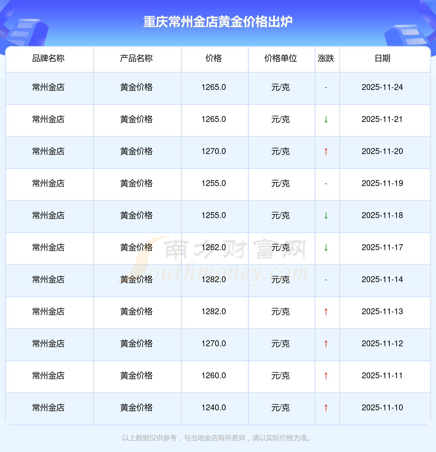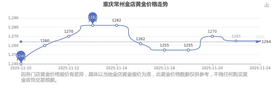 2025年11月24日重慶常州金店黃金價格:1265.0元/克。