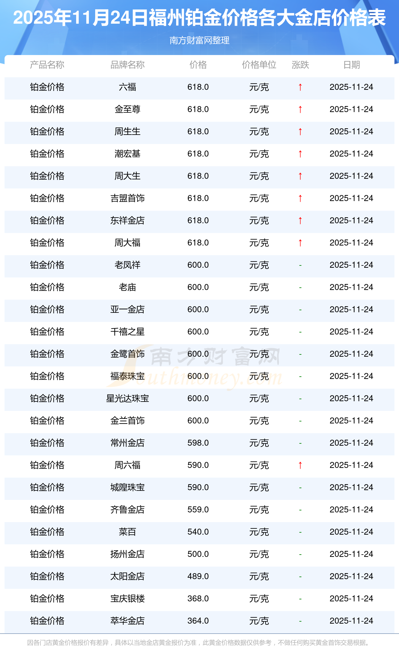 2025年11月24日福州各大金店鉑金價格最新價格:周大福17630.0,周大福40570.0,周大福1134.0元/克,老鳳祥1295.0元/克,老鳳祥600.0元/克,老鳳祥1295.0元/克,周六福1259.0元/克,周六福590.0元/克,周六福590.0元/克,周六福1154.0元/克,六福1293.0元/克。
