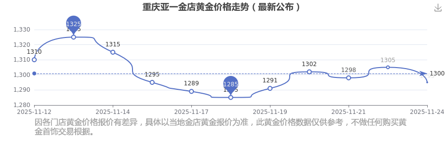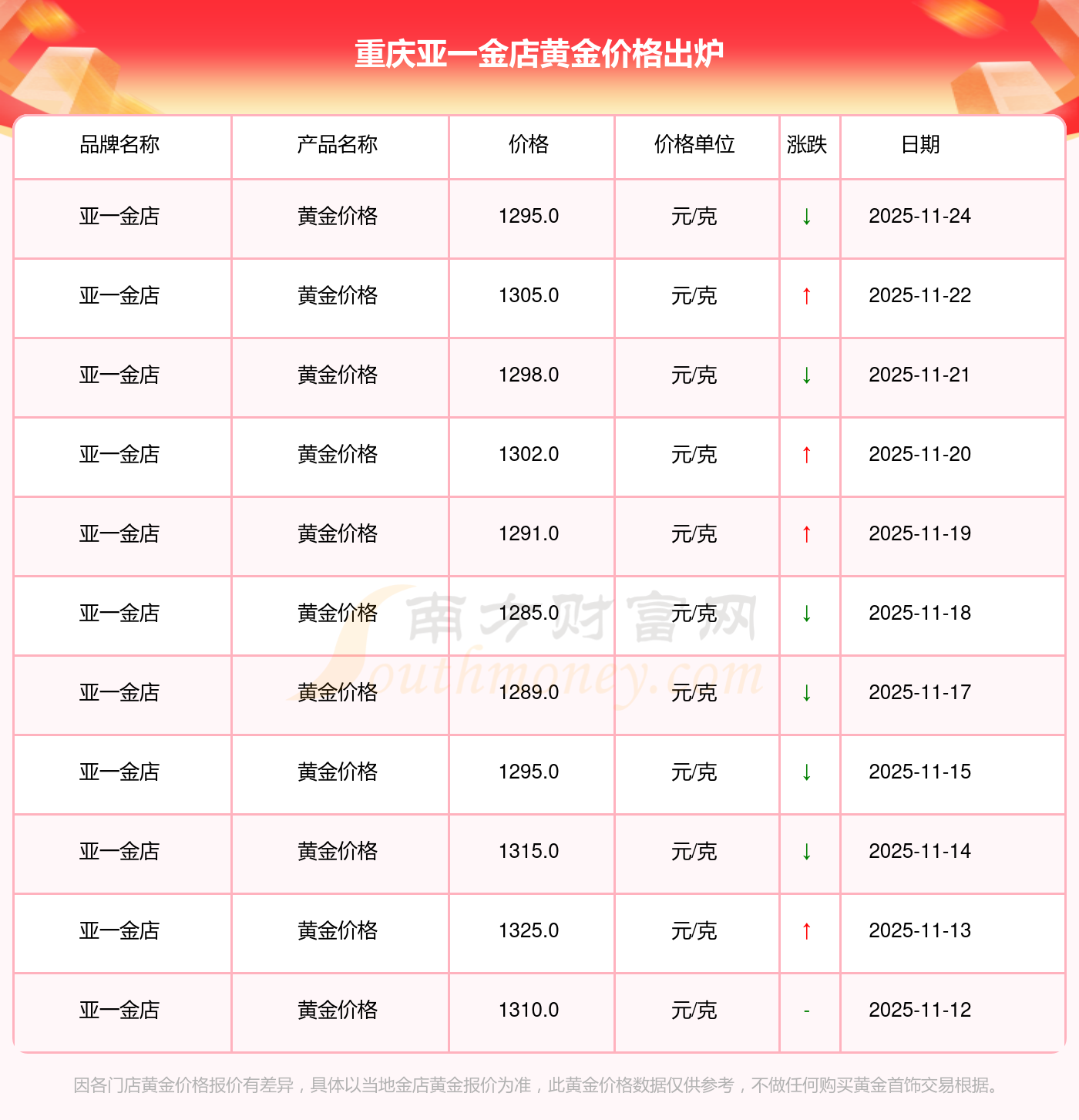 2025年11月24日,重慶亞一金店的黃金價格標價達到 1295.0元/克。