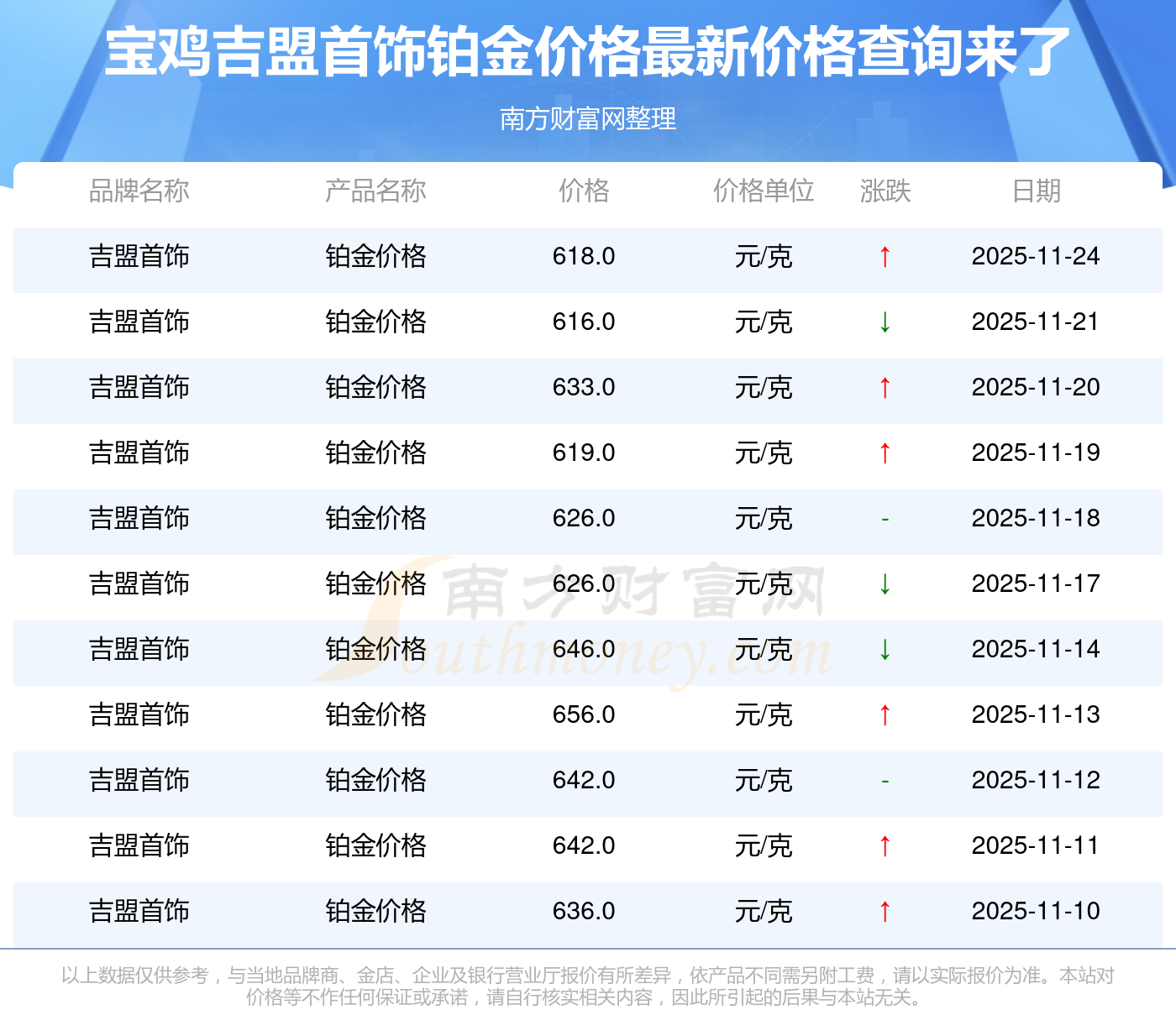 2025年11月24日,周大福、周大福、周大福、老鳳祥、老鳳祥、老鳳祥、周六福、周六福、周六福、周六福、六福等各大金店品牌鉑金價(jià)格今日價(jià)格如下:周大福17630.0、周大福40570.0、周大福1134.0元/克、老鳳祥1295.0元/克、老鳳祥600.0元/克、老鳳祥1295.0元/克、周六福1259.0元/克、周六福590.0元/克、周六福590.0元/克、周六福1154.0元/克、六福1293.0元/克。
