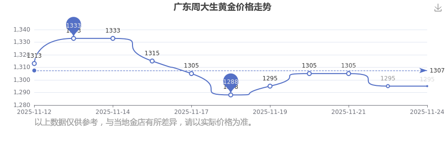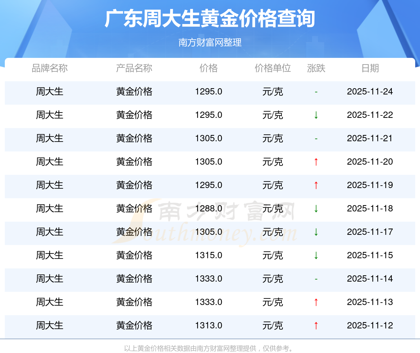 今日2025年11月24日,廣東周大生黃金價(jià)格為1295.0元/克。