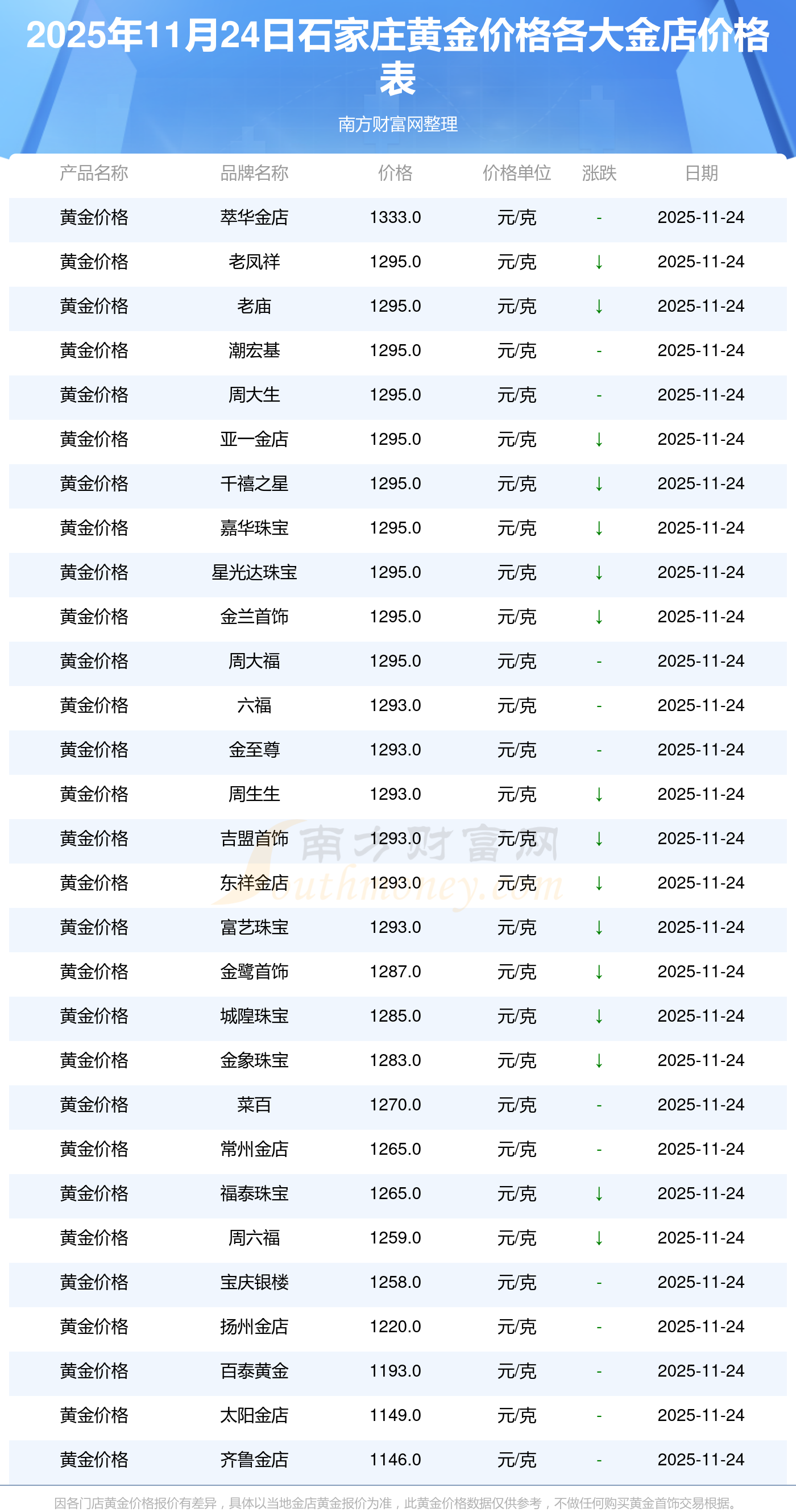 2025年11月24日,石家莊周大福、周大福、周大福、老鳳祥、老鳳祥、老鳳祥、周六福、周六福、周六福、周六福、六福等各大金店品牌黃金價(jià)格今日價(jià)格如下:周大福17630.0、周大福40570.0、周大福1134.0元/克、老鳳祥1295.0元/克、老鳳祥600.0元/克、老鳳祥1295.0元/克、周六福1259.0元/克、周六福590.0元/克、周六福590.0元/克、周六福1154.0元/克、六福1293.0元/克。