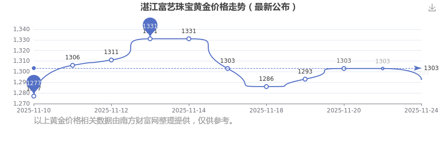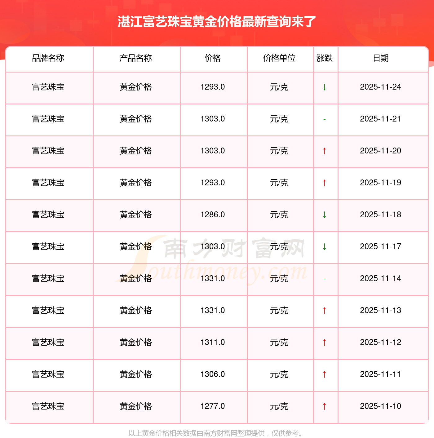 湛江富藝珠寶黃金價(jià)格現(xiàn)在每克多少錢?想知道今日一克黃金的出售價(jià)格是多少錢?今日湛江富藝珠寶黃金價(jià)格查詢,2025年11月24日,今日湛江富藝珠寶黃金價(jià)格:1293.0元/克。