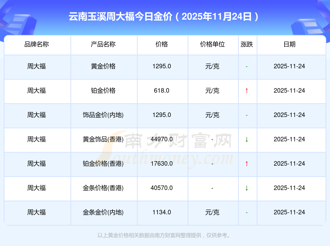 現(xiàn)在云南玉溪周大福黃金價格表_云南玉溪周大福黃金多少錢一克(2025年11月24日)