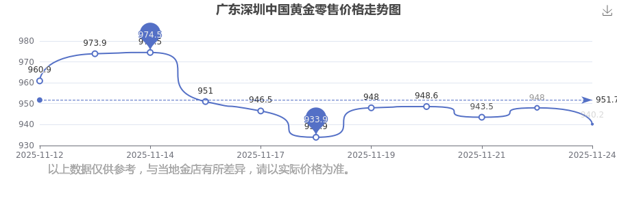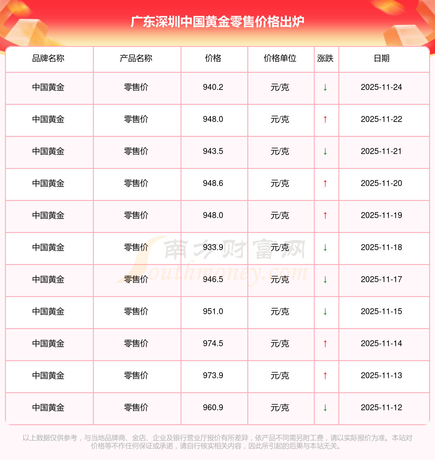 940.2元/克,此乃廣東深圳中國黃金于 2025年11月24日零售價的掛牌價格。