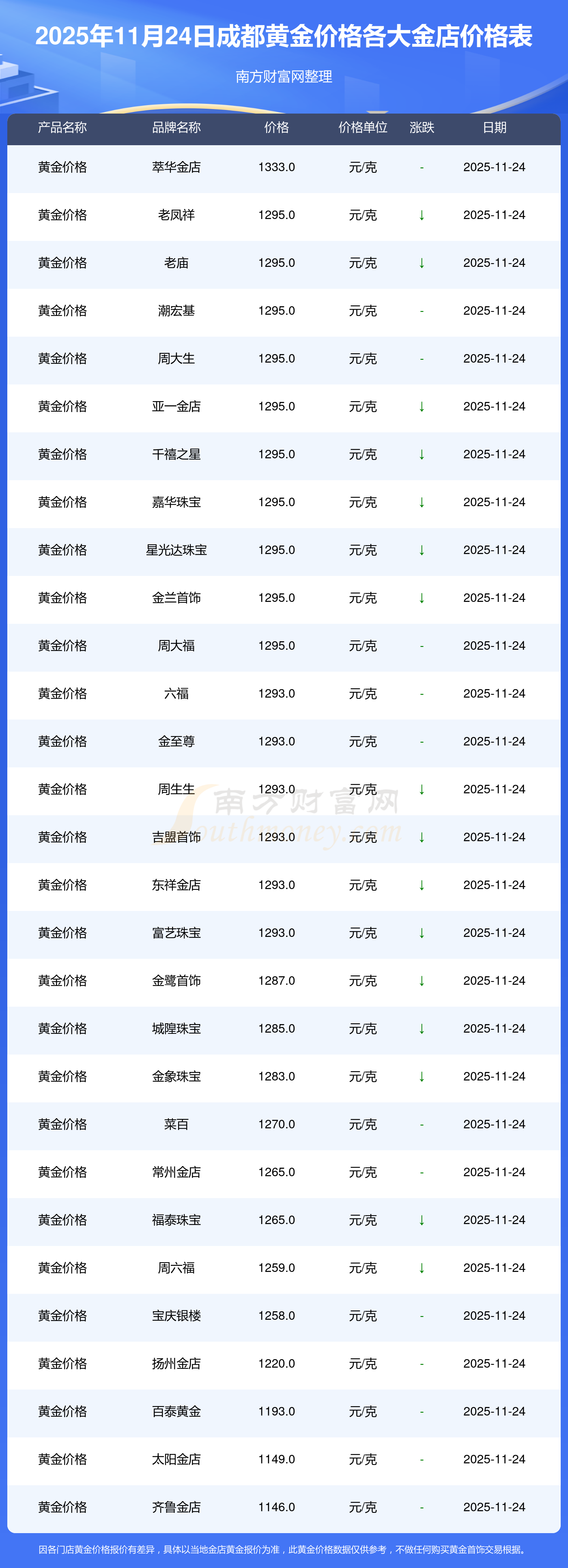 今天是2025年11月24日,成都周大福、周大福、周大福、老鳳祥、老鳳祥、老鳳祥、周六福、周六福、周六福、周六福、六福等各大金店品牌黃金價格最新價格行情是這樣的:周大福17630.0、周大福40570.0、周大福1134.0元/克、老鳳祥1295.0元/克、老鳳祥600.0元/克、老鳳祥1295.0元/克、周六福1259.0元/克、周六福590.0元/克、周六福590.0元/克、周六福1154.0元/克、六福1293.0元/克。