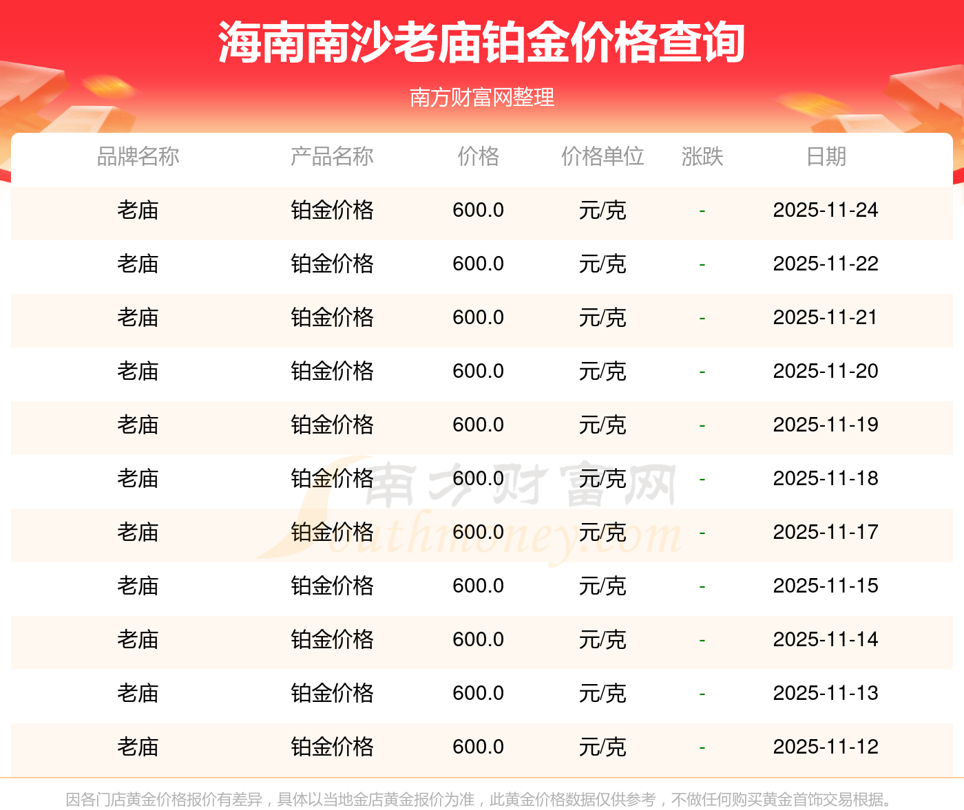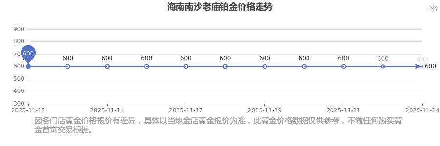 今日(2025年11月24日),海南南沙老廟鉑金價(jià)格的價(jià)格是600.0元/克。