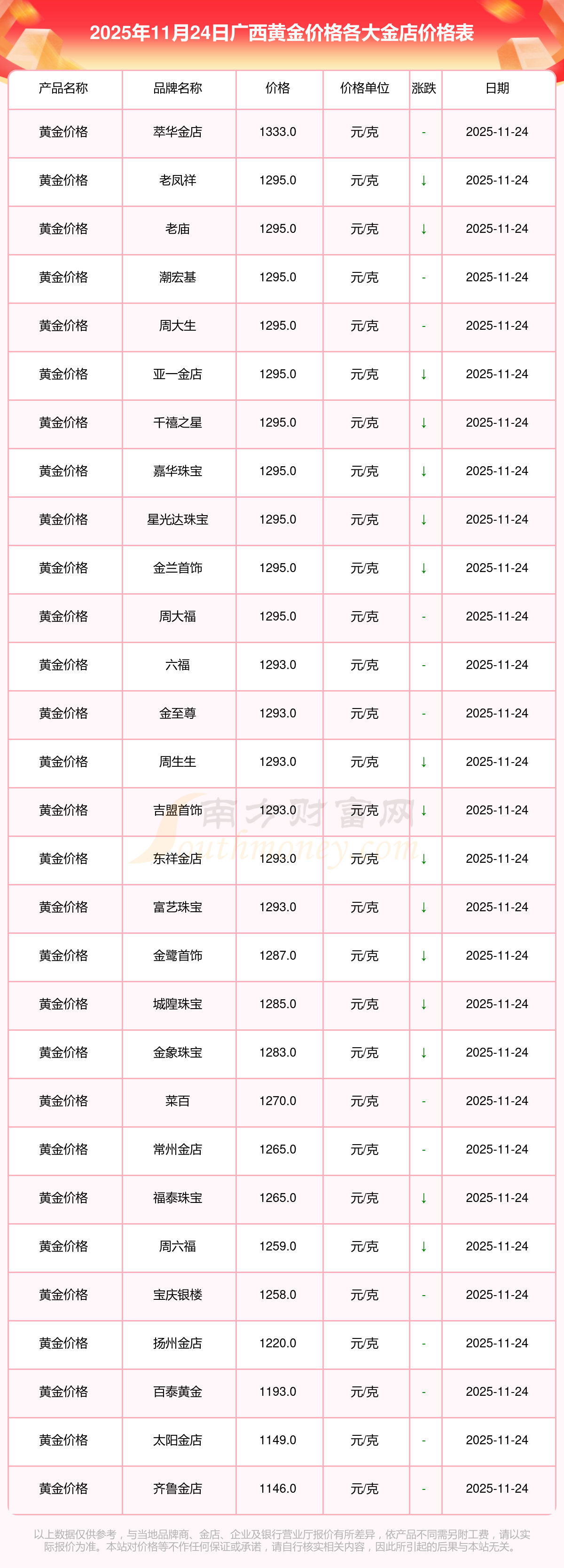 一、2025年11月24日,廣西周大福、周大福、周大福、老鳳祥、老鳳祥、老鳳祥、周六福、周六福、周六福、周六福、六福等各大金店品牌黃金價(jià)格今日價(jià)格行情最新來(lái)了:周大福17630.0、周大福40570.0、周大福1134.0元/克、老鳳祥1295.0元/克、老鳳祥600.0元/克、老鳳祥1295.0元/克、周六福1259.0元/克、周六福590.0元/克、周六福590.0元/克、周六福1154.0元/克、六福1293.0元/克。