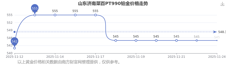 于 2025年11月24日,山東濟(jì)南菜百PT990鉑金的克價(jià)為545.0元/克。