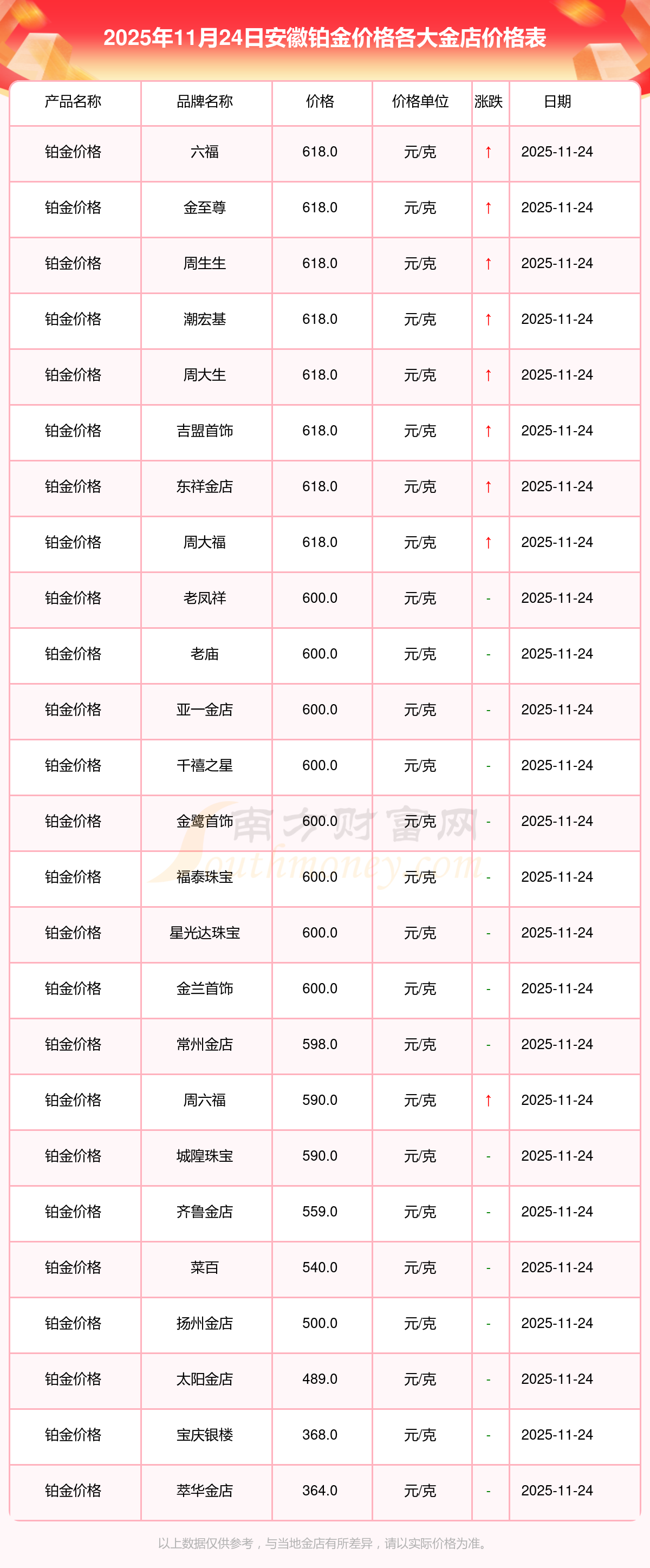 2025年11月24日,安徽周大福、周大福、周大福、老鳳祥、老鳳祥、老鳳祥、周六福、周六福、周六福、周六福、六福等各大金店品牌鉑金價格今日價格行情最新來了:周大福17630.0、周大福40570.0、周大福1134.0元/克、老鳳祥1295.0元/克、老鳳祥600.0元/克、老鳳祥1295.0元/克、周六福1259.0元/克、周六福590.0元/克、周六福590.0元/克、周六福1154.0元/克、六福1293.0元/克。