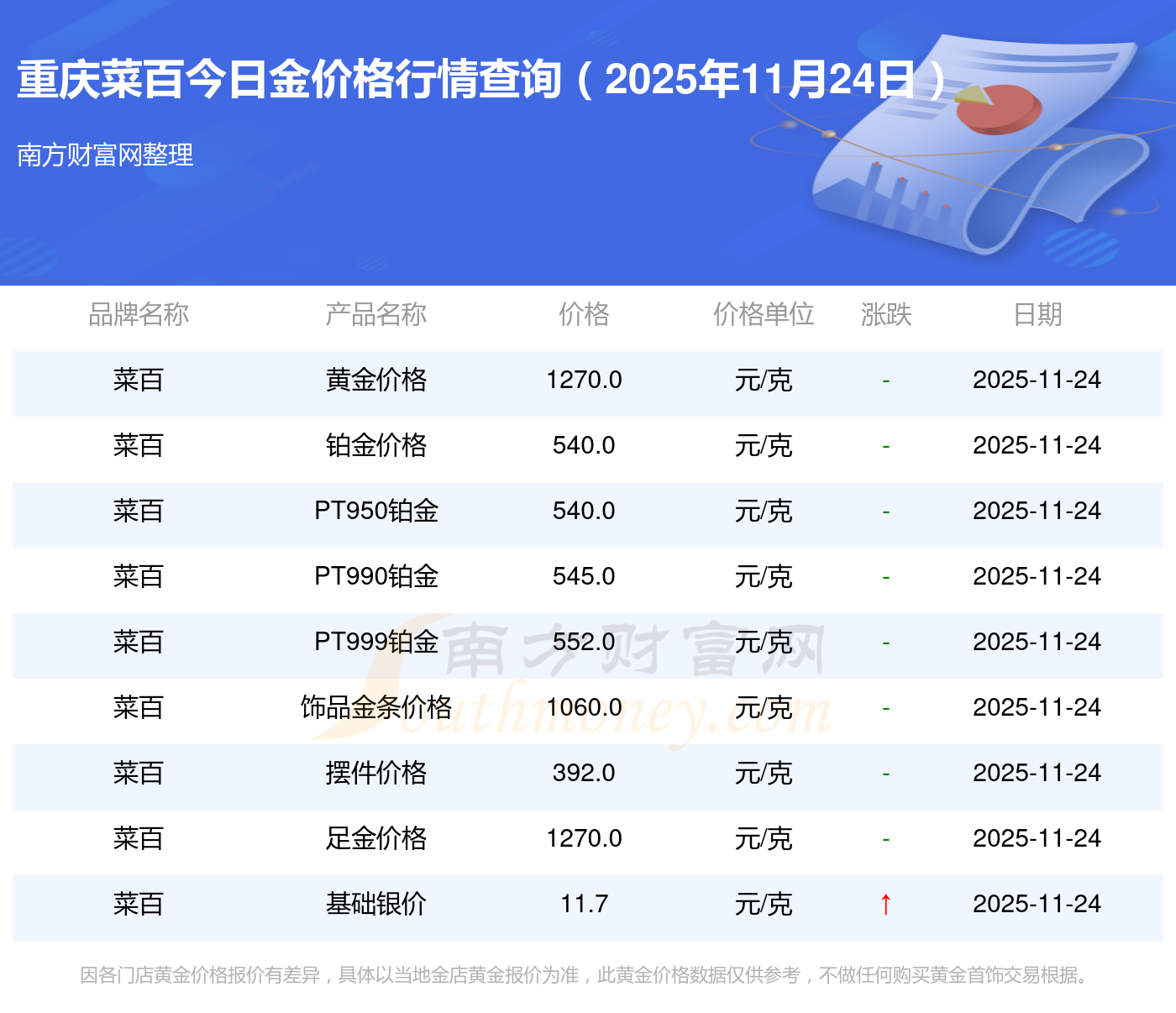 2025年11月24日重慶菜百最新價(jià)格:鉑金價(jià)格(香港)17630.0,金條價(jià)格(香港)40570.0,金條金價(jià)(內(nèi)地)1134.0元/克,黃金價(jià)格1295.0元/克,鉑金價(jià)格600.0元/克,足金價(jià)格1295.0元/克,黃金價(jià)格1259.0元/克,鉑金價(jià)格590.0元/克,PT999鉑金價(jià)格590.0元/克,金條價(jià)格1154.0元/克,黃金價(jià)格1293.0元/克。