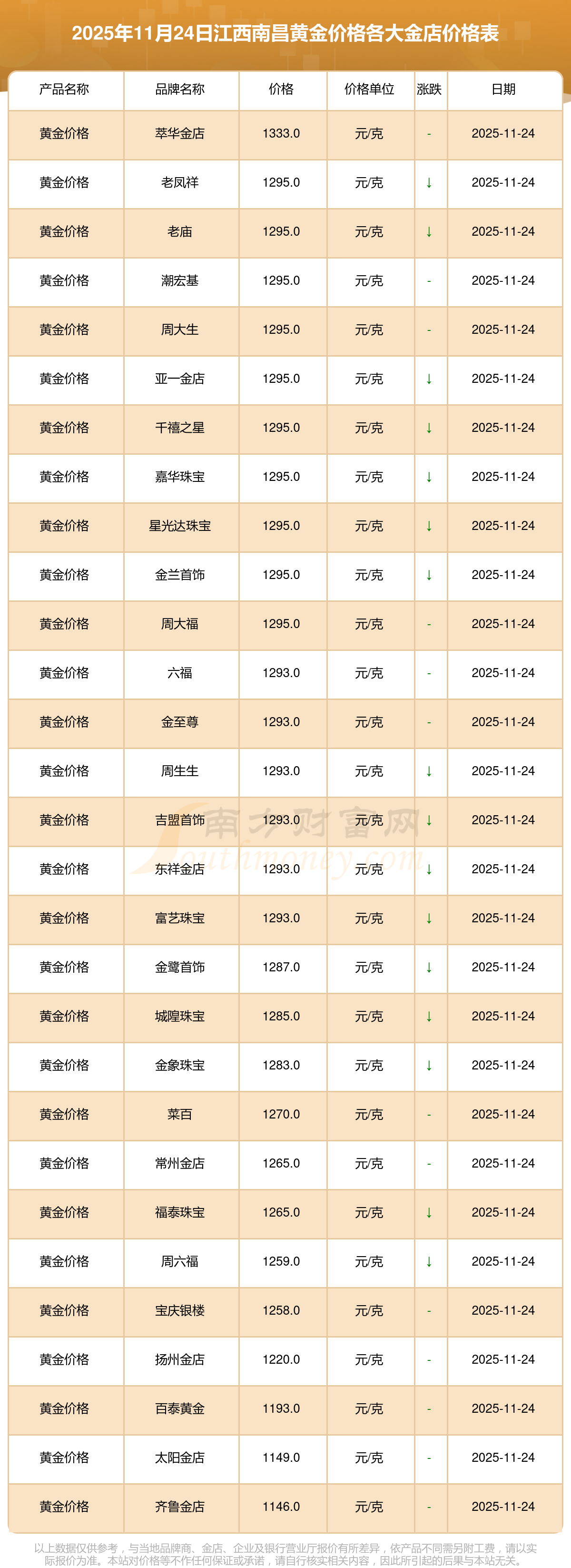 2025年11月24日江西南昌周大福、周大福、周大福、老鳳祥、老鳳祥、老鳳祥、周六福、周六福、周六福、周六福、六福等各大金店品牌黃金價(jià)格最新價(jià)格行情來了,如下:周大福鉑金價(jià)格(香港)17630.0,周大福金條價(jià)格(香港)40570.0,周大福金條金價(jià)(內(nèi)地)1134.0元/克,老鳳祥黃金價(jià)格1295.0元/克,老鳳祥鉑金價(jià)格600.0元/克,老鳳祥足金價(jià)格1295.0元/克,周六福黃金價(jià)格1259.0元/克,周六福鉑金價(jià)格590.0元/克,周六福PT999鉑金價(jià)格590.0元/克,周六福金條價(jià)格1154.0元/克,六福黃金價(jià)格1293.0元/克。