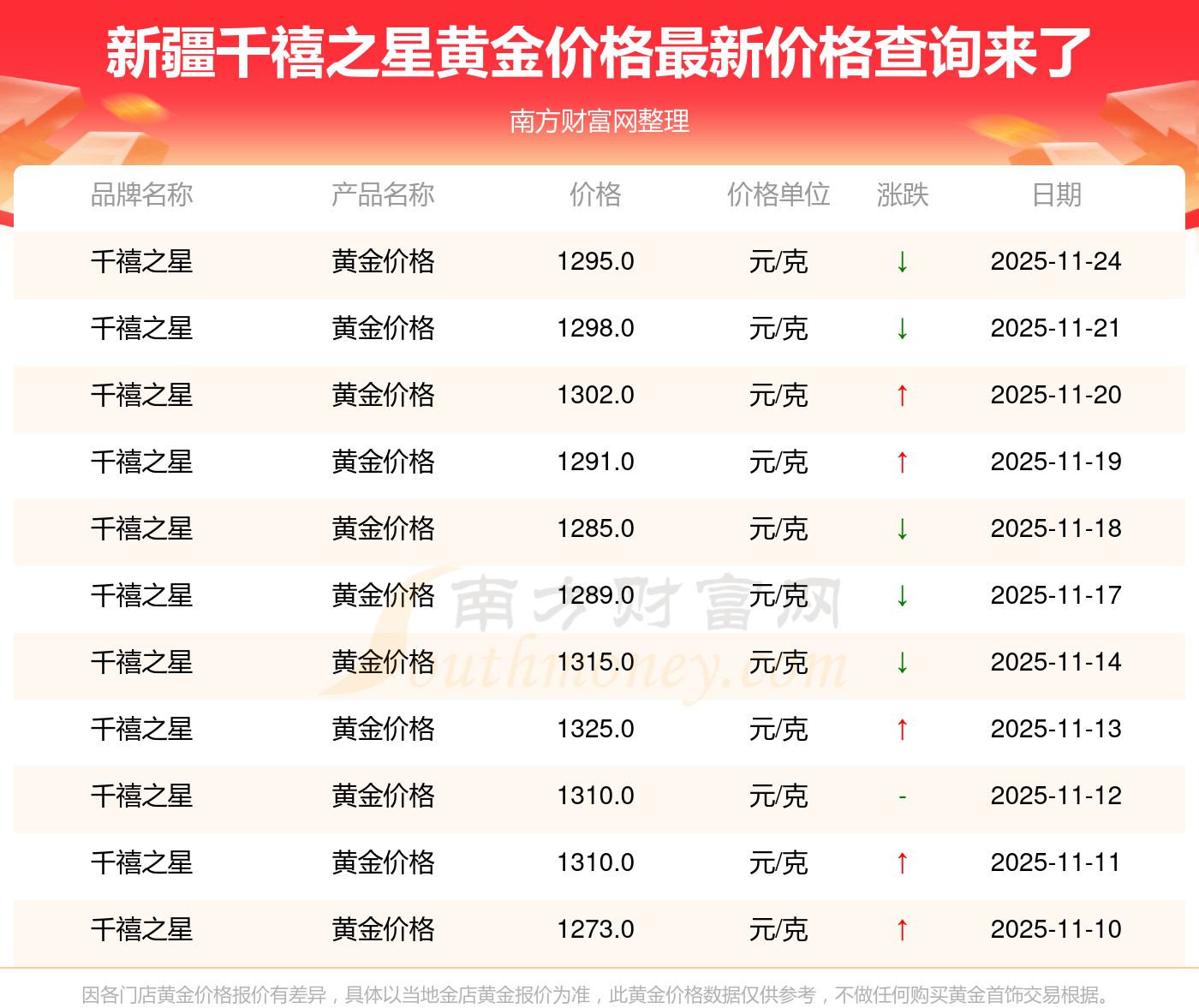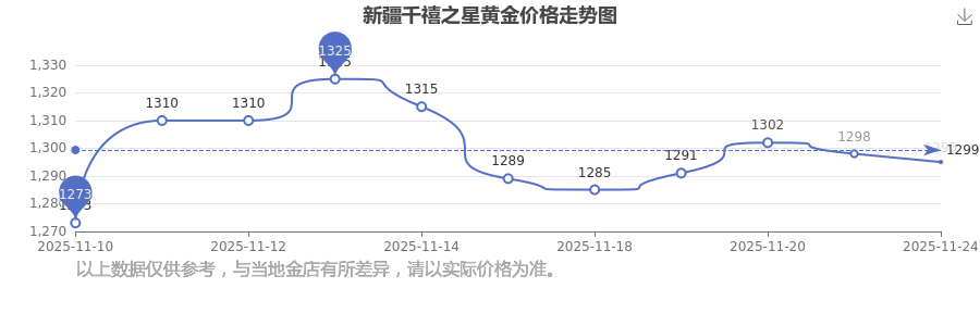 (2025年11月24日)今日新疆千禧之星黃金價(jià)格是1295.0元/克。