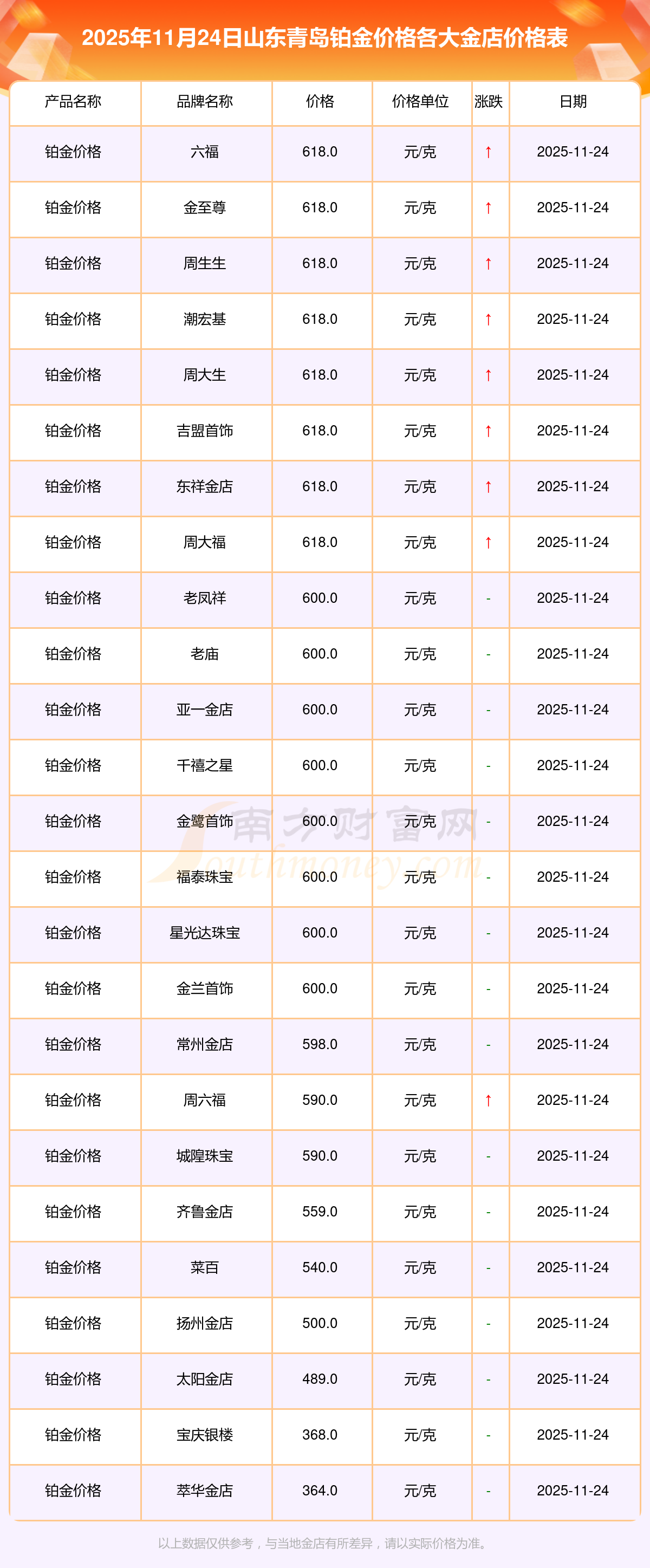2025年11月24日山東青島各大金店鉑金價(jià)格最新價(jià)格:周大福17630.0,周大福40570.0,周大福1134.0元/克,老鳳祥1295.0元/克,老鳳祥600.0元/克,老鳳祥1295.0元/克,周六福1259.0元/克,周六福590.0元/克,周六福590.0元/克,周六福1154.0元/克,六福1293.0元/克。