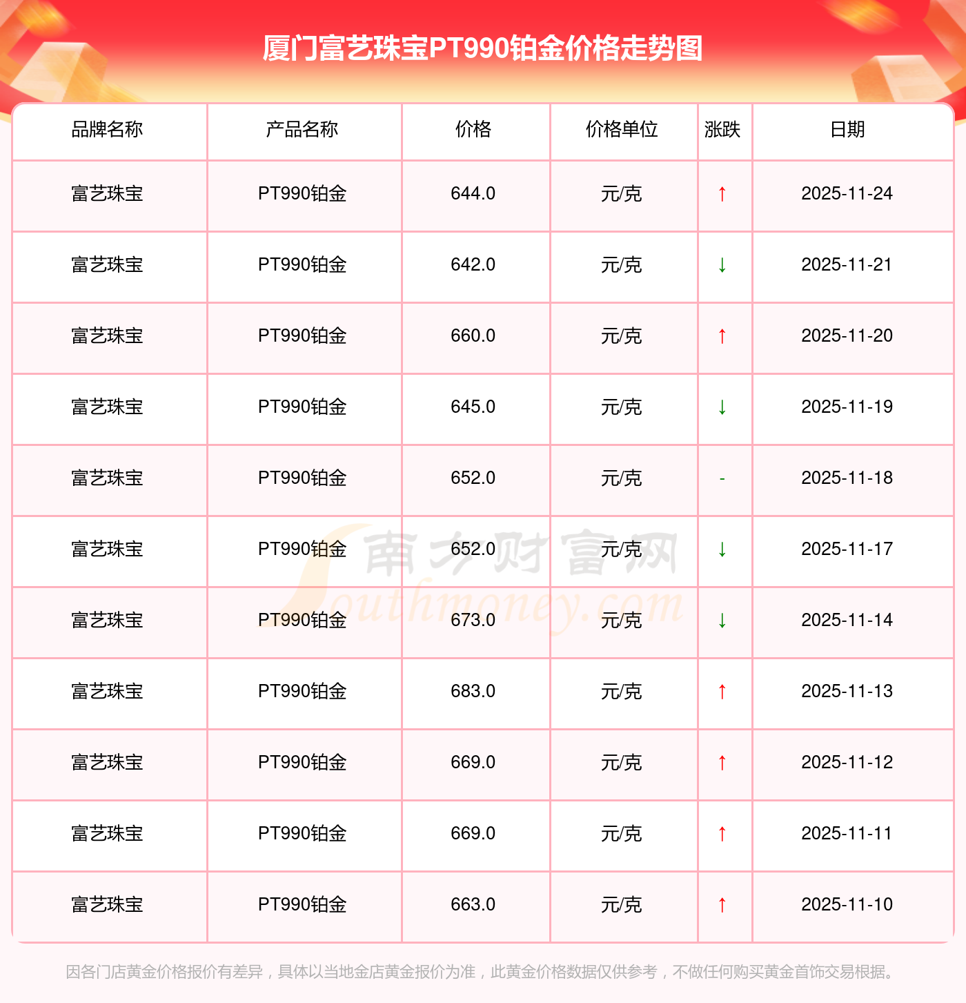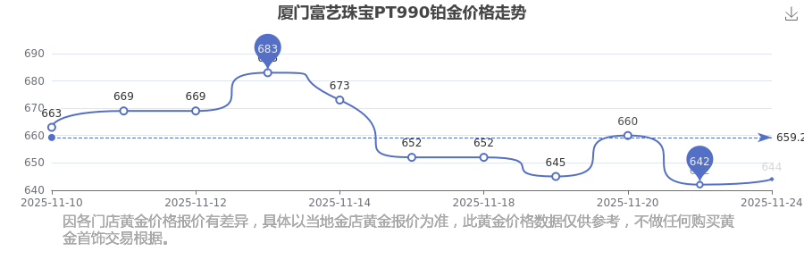 2025年11月24日,廈門富藝珠寶所售PT990鉑金,其價(jià)格設(shè)定為 644.0元/克。