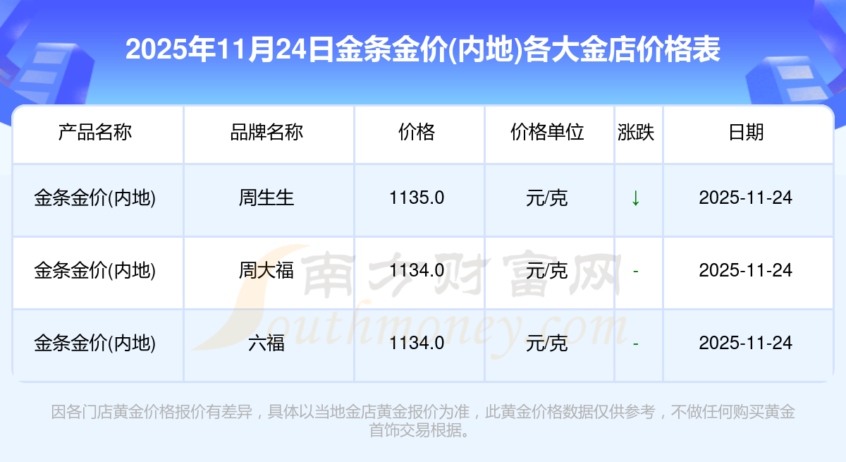 2025年11月24日各大金店金條金價(內(nèi)地)最新價格:周大福17630.0,周大福40570.0,周大福1134.0元/克,老鳳祥1295.0元/克,老鳳祥600.0元/克,老鳳祥1295.0元/克,周六福1259.0元/克,周六福590.0元/克,周六福590.0元/克,周六福1154.0元/克,六福1293.0元/克。