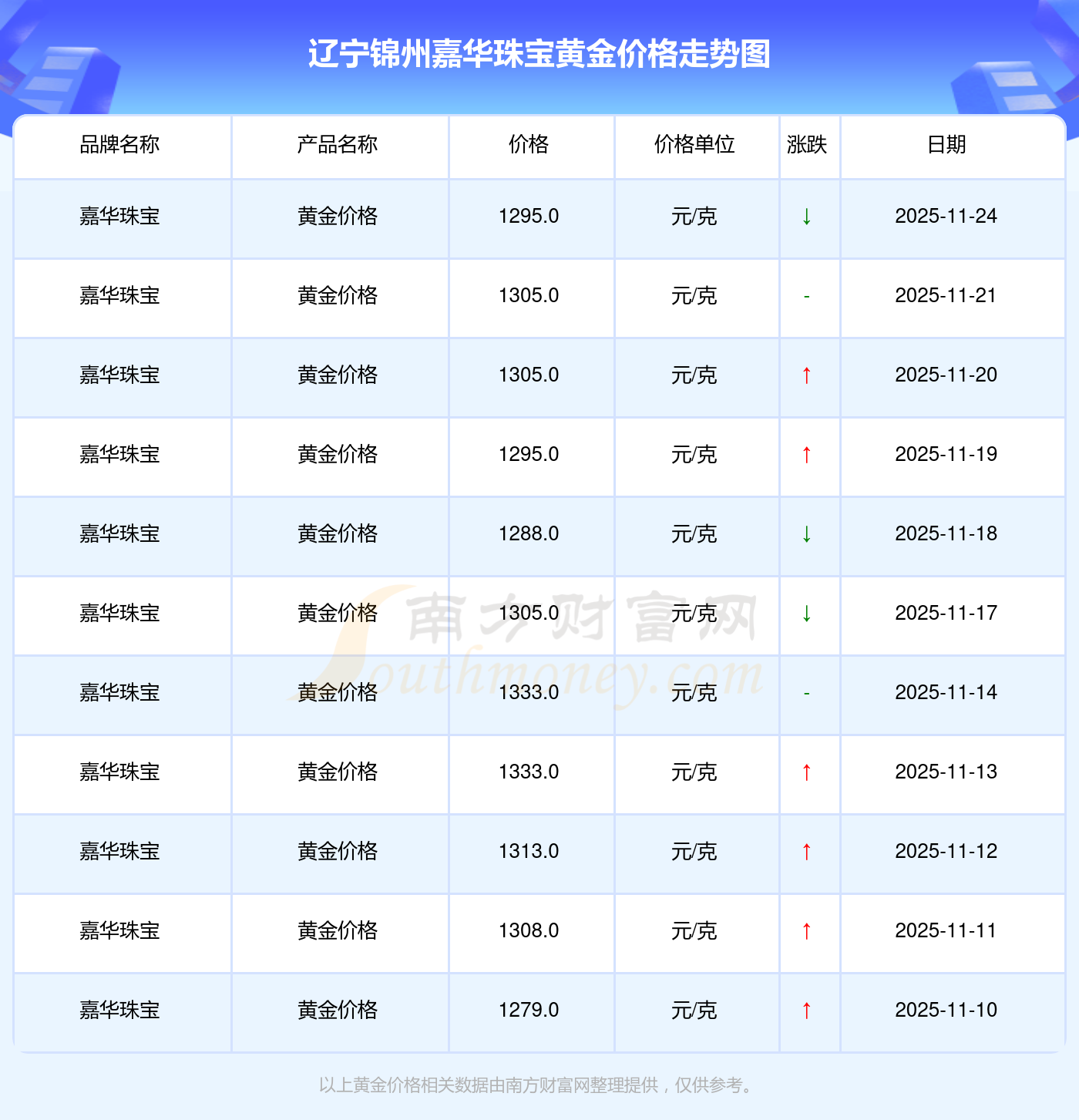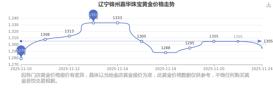 今日遼寧錦州嘉華珠寶黃金價(jià)格為1295.0元/克。