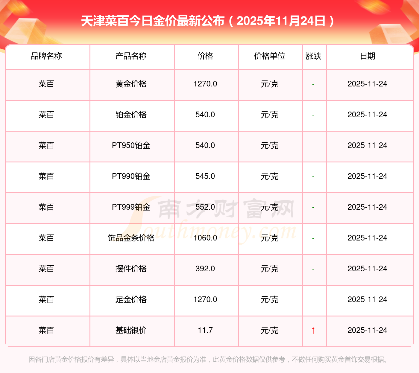 今日黃金價格查詢_現(xiàn)在金價黃金一克多少錢,黃金價格是多少錢一克?2025年11月24日天津菜百黃金一克的市場行情價是多少?鉑金價格(香港)17630.0,金條價格(香港)40570.0,金條金價(內(nèi)地)1134.0元/克,黃金價格1295.0元/克,鉑金價格600.0元/克,足金價格1295.0元/克,黃金價格1259.0元/克,鉑金價格590.0元/克,PT999鉑金價格590.0元/克,金條價格1154.0元/克,黃金價格1293.0元/克。