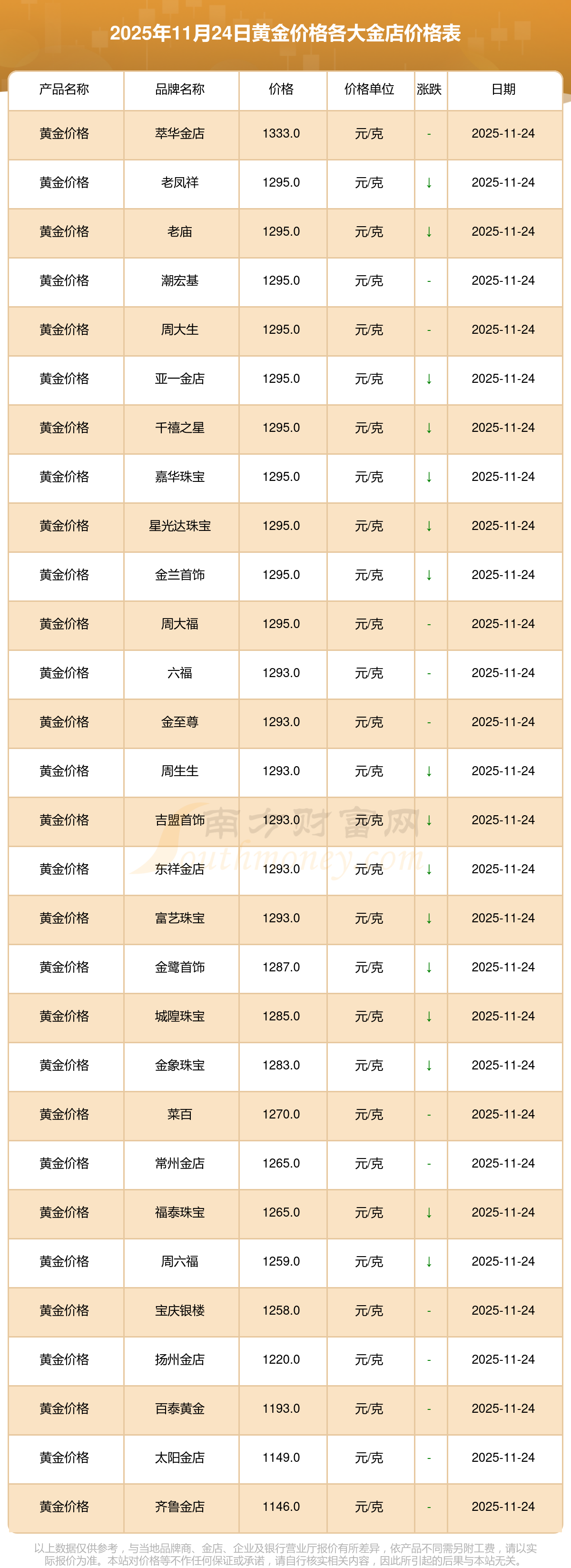 因各門店黃金價格報價有差異,具體以當?shù)亟鸬挈S金報價為準,此黃金價格數(shù)據僅供參考,不做任何購買黃金首飾交易根據。