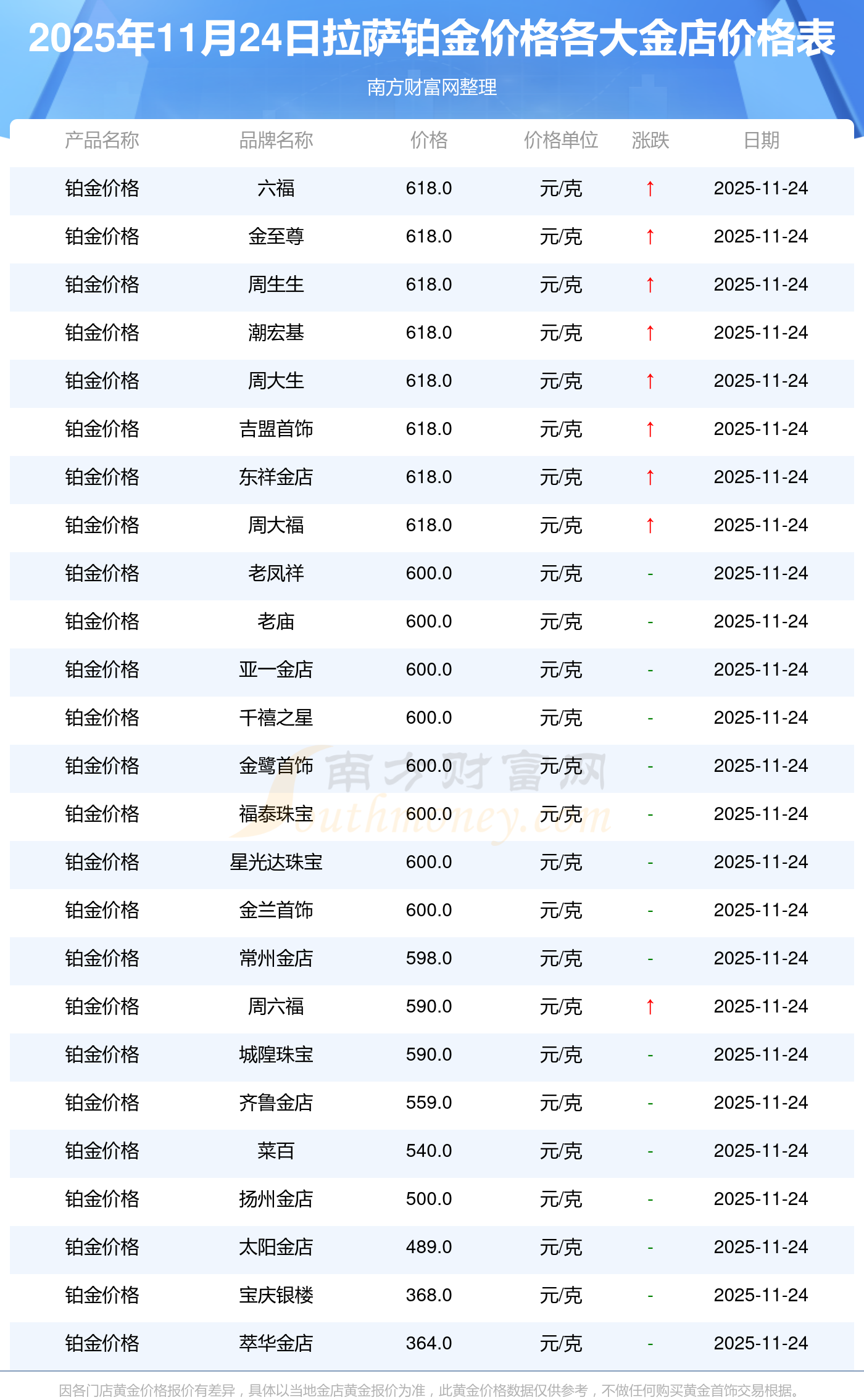 2025年11月24日拉薩各大金店鉑金價格最新價格:周大福17630.0,周大福40570.0,周大福1134.0元/克,老鳳祥1295.0元/克,老鳳祥600.0元/克,老鳳祥1295.0元/克,周六福1259.0元/克,周六福590.0元/克,周六福590.0元/克,周六福1154.0元/克,六福1293.0元/克。