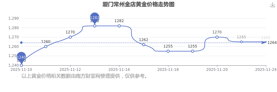 廈門常州金店在 2025年11月24日,黃金價(jià)格的售賣價(jià)格是 1265.0元/克。