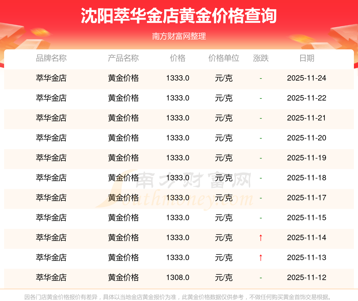 1333.0元/克的黃金價(jià)格,是沈陽(yáng)萃華金店在 2025年11月24日給出的。