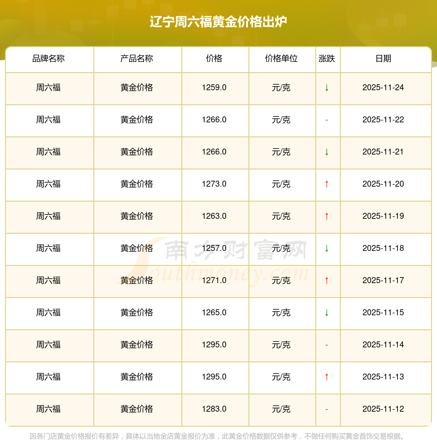 2025年11月24日各大金店黃金價(jià)格最新價(jià)格:周大福17630.0,周大福40570.0,周大福1134.0元/克,老鳳祥1295.0元/克,老鳳祥600.0元/克,老鳳祥1295.0元/克,周六福1259.0元/克,周六福590.0元/克,周六福590.0元/克,周六福1154.0元/克,六福1293.0元/克。