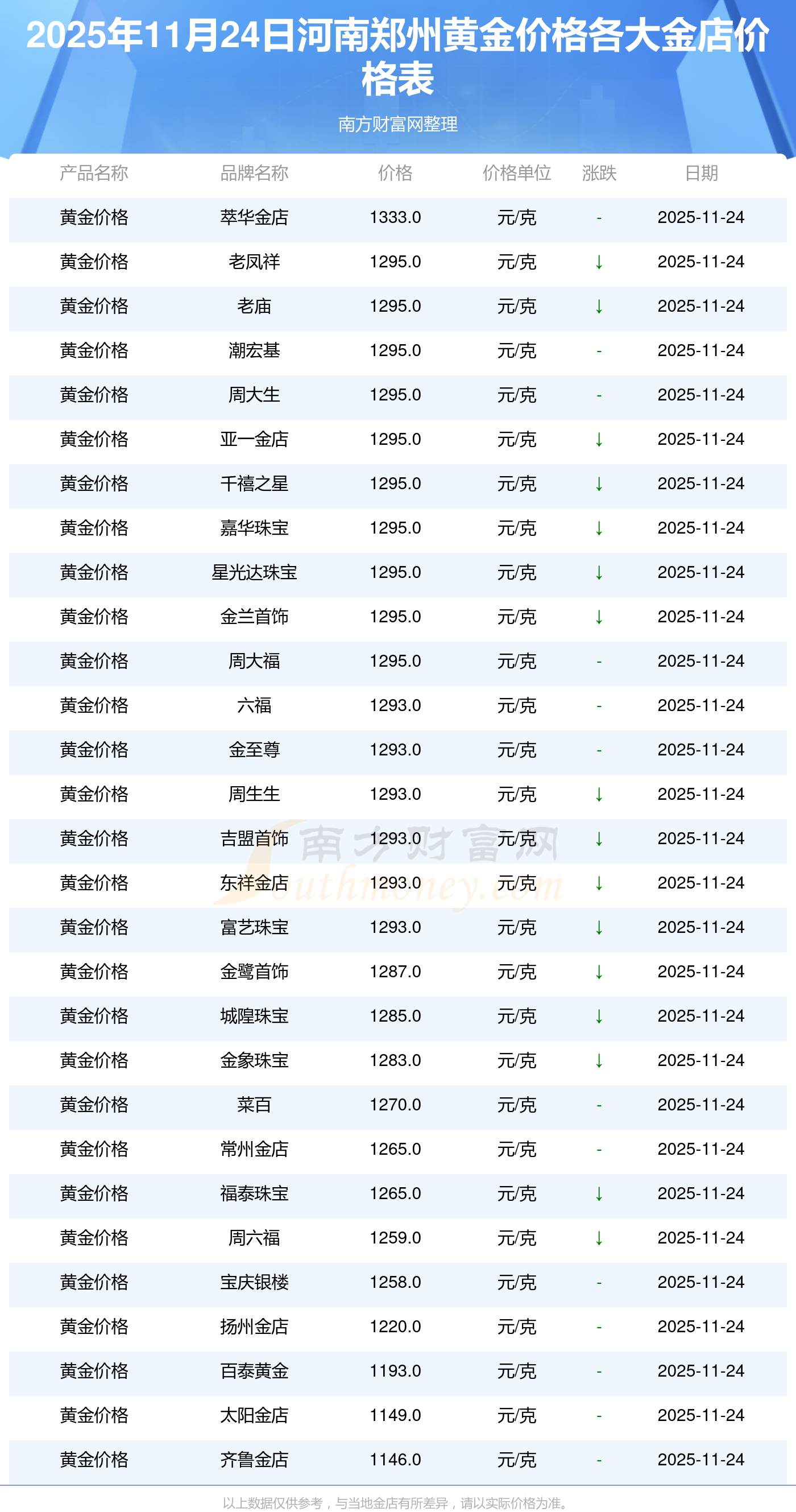 2025年11月24日河南鄭州各大金店黃金價格最新價格:周大福17630.0,周大福40570.0,周大福1134.0元/克,老鳳祥1295.0元/克,老鳳祥600.0元/克,老鳳祥1295.0元/克,周六福1259.0元/克,周六福590.0元/克,周六福590.0元/克,周六福1154.0元/克,六福1293.0元/克。