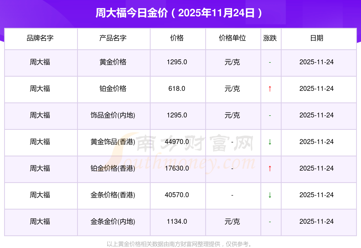 2025年11月24日周大福金價查詢:鉑金價格(香港)17630.0,金條價格(香港)40570.0,金條金價(內(nèi)地)1134.0元/克,黃金價格1295.0元/克,鉑金價格600.0元/克,足金價格1295.0元/克,黃金價格1259.0元/克,鉑金價格590.0元/克,PT999鉑金價格590.0元/克,金條價格1154.0元/克,黃金價格1293.0元/克。