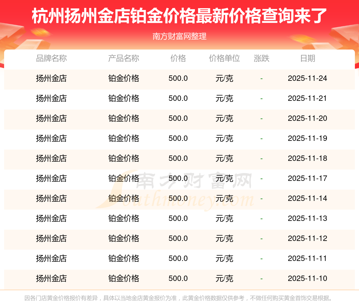2025年11月24日這一天,杭州揚州金店的鉑金價格以 500.0元/克的價格售賣。