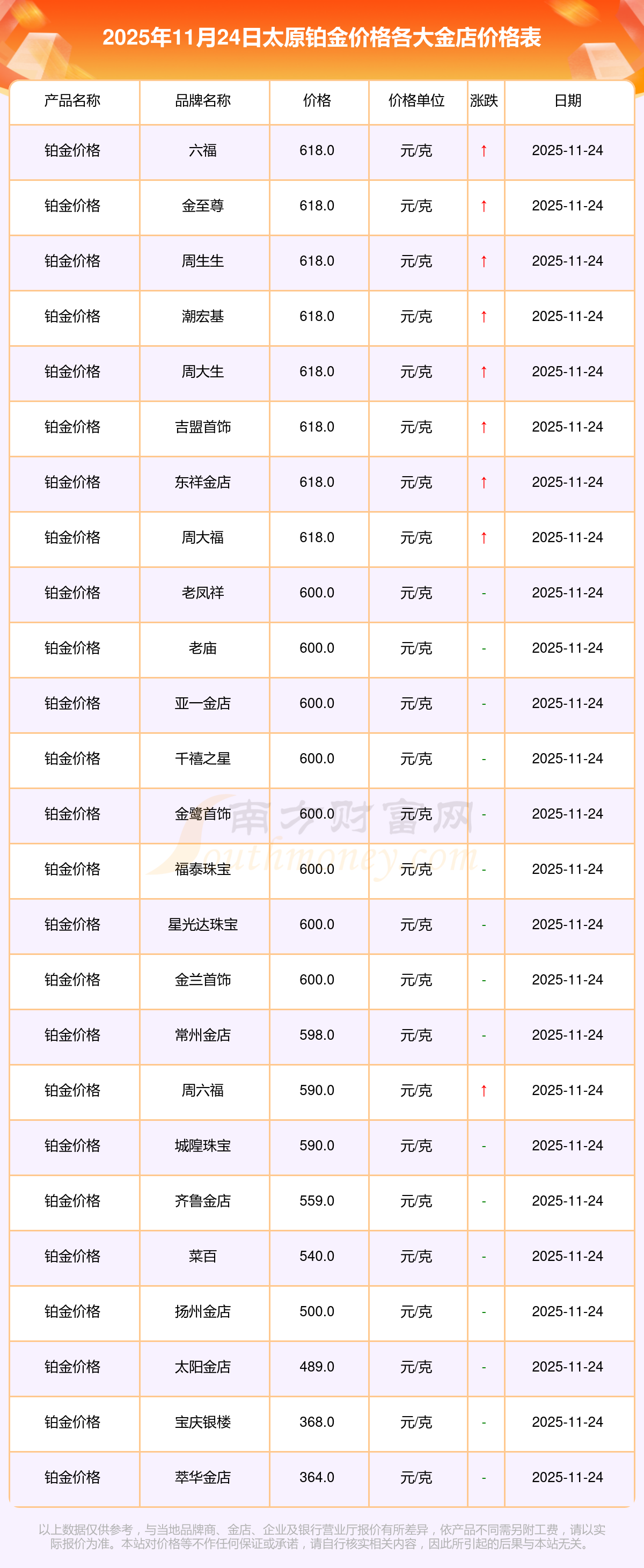 一、2025年11月24日太原各品牌金店實時鉑金價格表