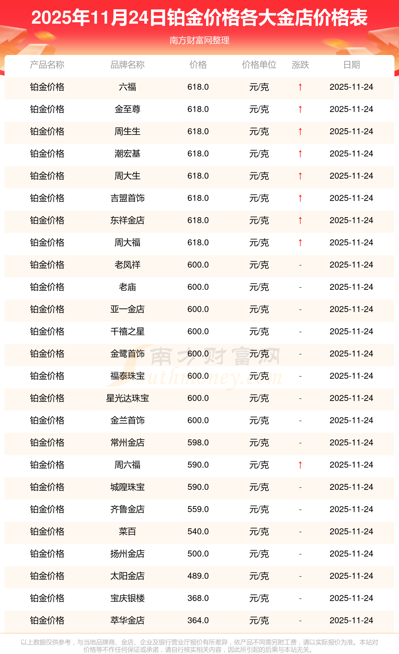 2025年11月24日各大金店鉑金價格最新價格:周大福17630.0,周大福40570.0,周大福1134.0元/克,老鳳祥1295.0元/克,老鳳祥600.0元/克,老鳳祥1295.0元/克,周六福1259.0元/克,周六福590.0元/克,周六福590.0元/克,周六福1154.0元/克,六福1293.0元/克。