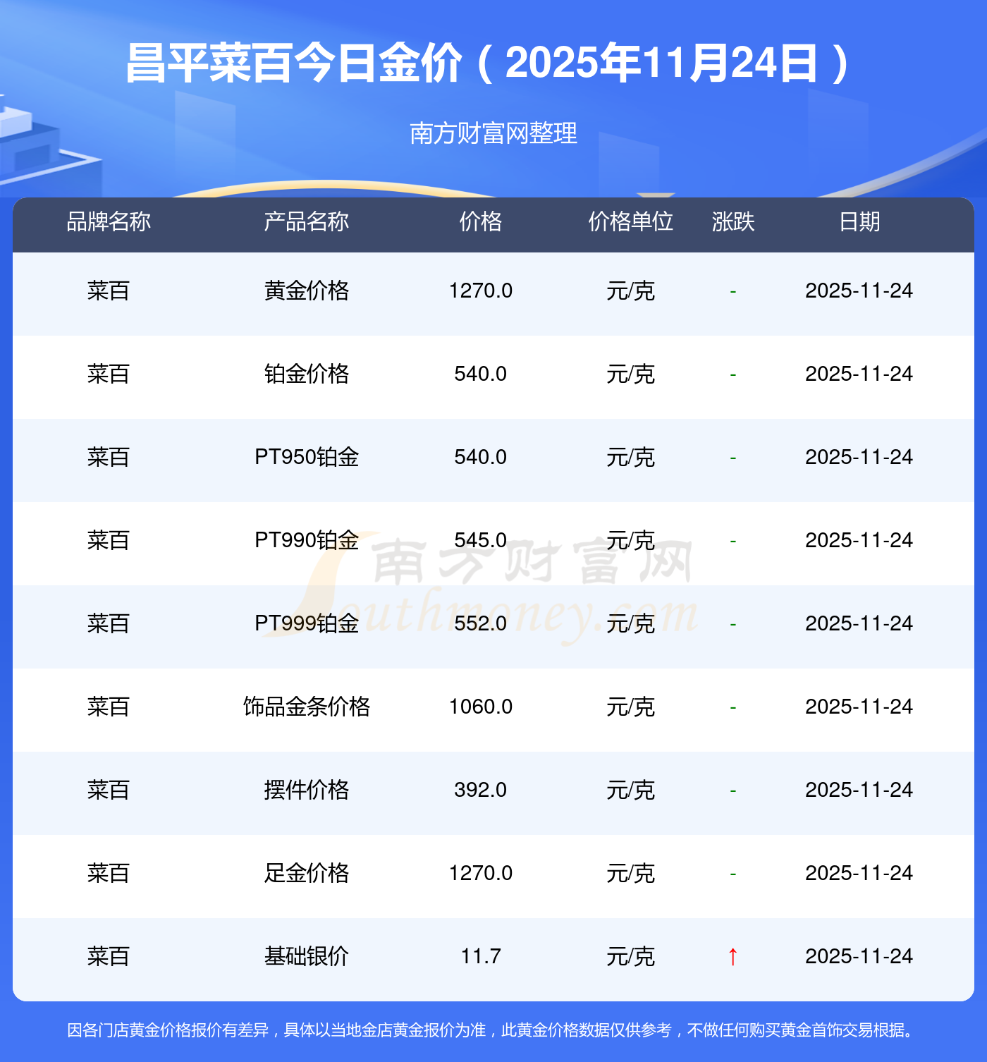 因各門店黃金價格報價有差異,具體以當(dāng)?shù)亟鸬挈S金報價為準(zhǔn),此黃金價格數(shù)據(jù)僅供參考,不做任何購買黃金首飾交易根據(jù)。