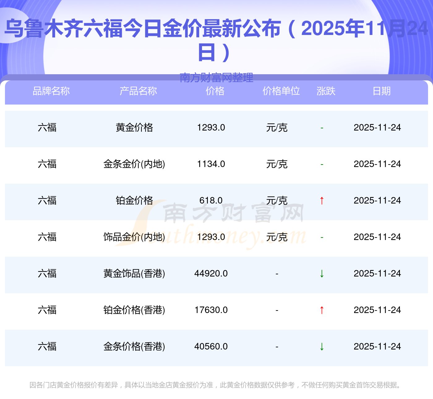 2025年11月24日烏魯木齊六福黃金的單價(jià),一克為多少?鉑金價(jià)格(香港)17630.0,金條價(jià)格(香港)40570.0,金條金價(jià)(內(nèi)地)1134.0元/克,黃金價(jià)格1295.0元/克,鉑金價(jià)格600.0元/克,足金價(jià)格1295.0元/克,黃金價(jià)格1259.0元/克,鉑金價(jià)格590.0元/克,PT999鉑金價(jià)格590.0元/克,金條價(jià)格1154.0元/克,黃金價(jià)格1293.0元/克。