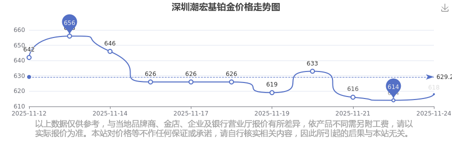 2025年11月24日,今日深圳潮宏基鉑金價(jià)格:618.0元/克。