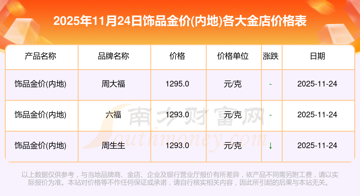 2025年11月24日周大福、周大福、周大福、老鳳祥、老鳳祥、老鳳祥、周六福、周六福、周六福、周六福、六福等各大金店品牌飾品金價(內(nèi)地)最新價格如下:周大福鉑金價格(香港)17630.0,周大福金條價格(香港)40570.0,周大福金條金價(內(nèi)地)1134.0元/克,老鳳祥黃金價格1295.0元/克,老鳳祥鉑金價格600.0元/克,老鳳祥足金價格1295.0元/克,周六福黃金價格1259.0元/克,周六福鉑金價格590.0元/克,周六福PT999鉑金價格590.0元/克,周六福金條價格1154.0元/克,六福黃金價格1293.0元/克。
