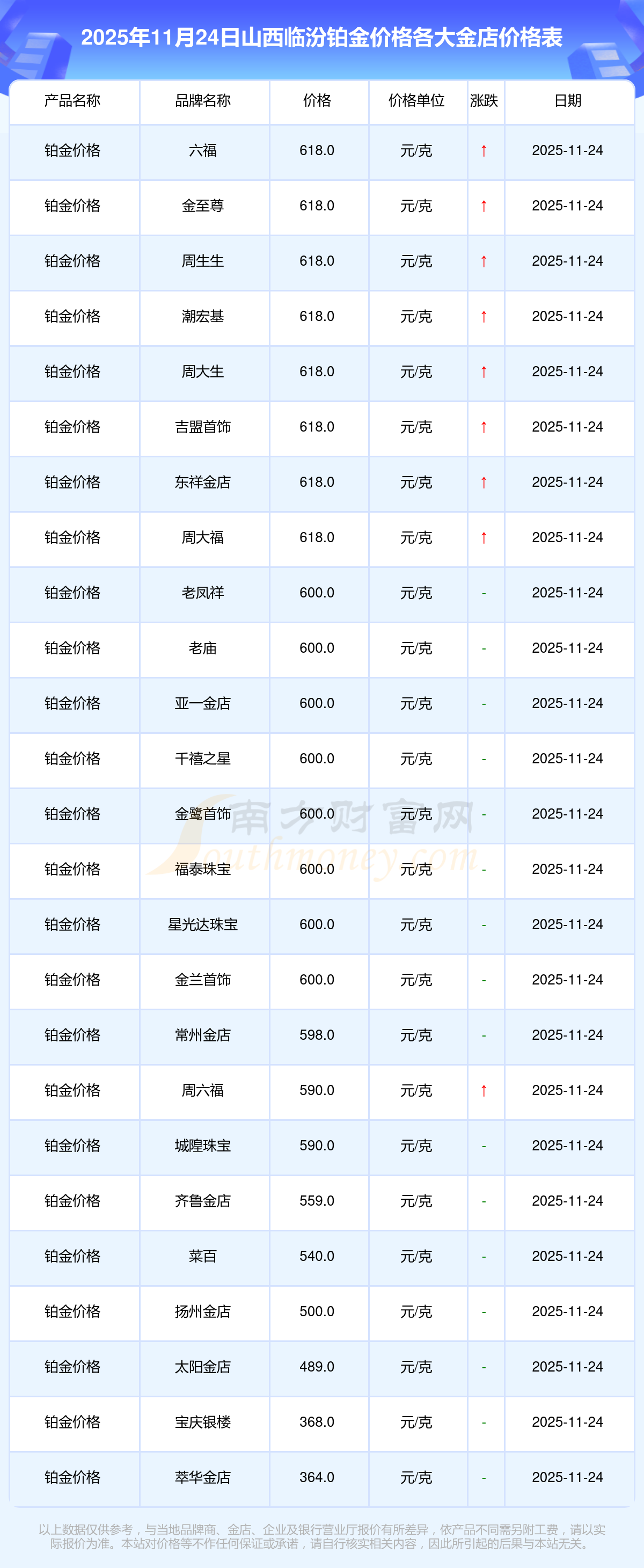 2025年11月24日,山西臨汾周大福、周大福、周大福、老鳳祥、老鳳祥、老鳳祥、周六福、周六福、周六福、周六福、六福等各大金店品牌鉑金價(jià)格今日價(jià)格行情最新來了:周大福17630.0、周大福40570.0、周大福1134.0元/克、老鳳祥1295.0元/克、老鳳祥600.0元/克、老鳳祥1295.0元/克、周六福1259.0元/克、周六福590.0元/克、周六福590.0元/克、周六福1154.0元/克、六福1293.0元/克。