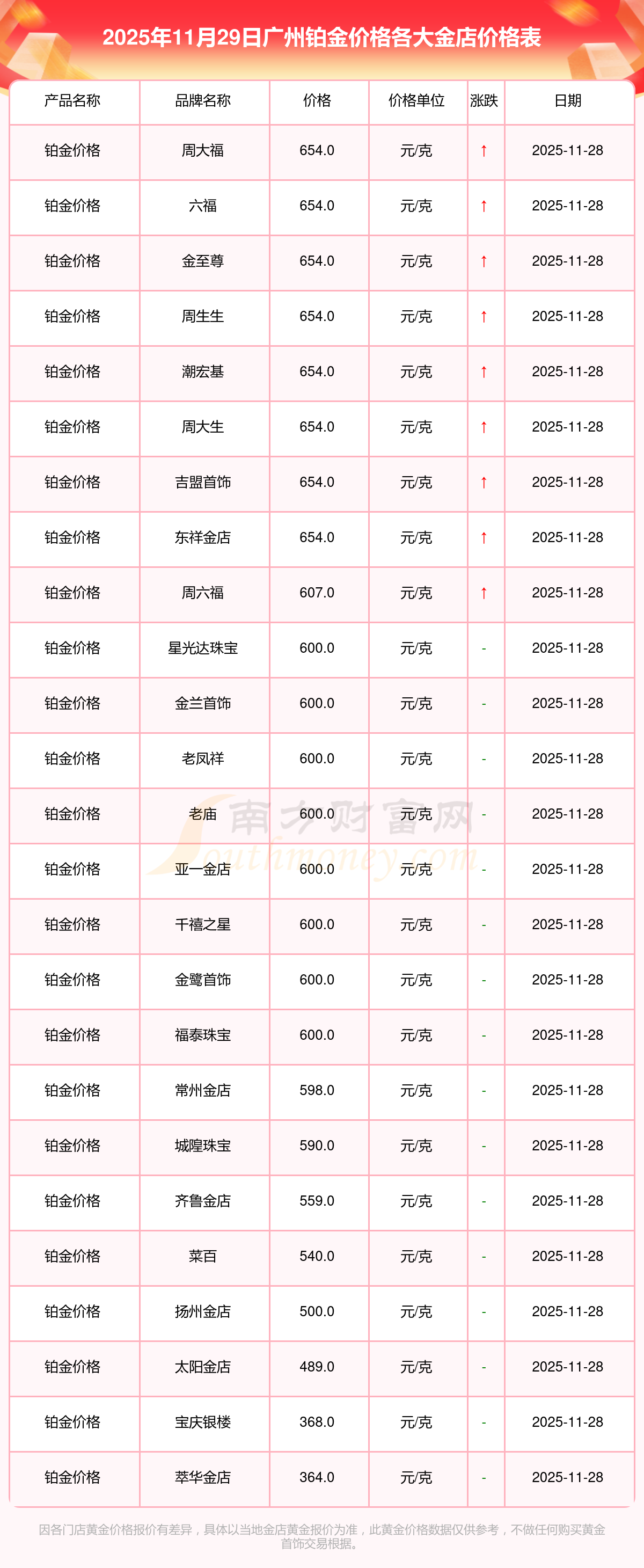 今天是2025年11月29日,廣州星光達(dá)珠寶、星光達(dá)珠寶、寶泉錢幣、金蘭首飾、金蘭首飾、謝瑞麟、謝瑞麟、謝瑞麟、謝瑞麟、謝瑞麟、金銀街等各大金店品牌鉑金價格最新價格行情是這樣的:星光達(dá)珠寶1321.0元/克、星光達(dá)珠寶600.0元/克、寶泉錢幣12.6元/克、金蘭首飾1321.0元/克、金蘭首飾600.0元/克、謝瑞麟1207.0元/克、謝瑞麟1321.0元/克、謝瑞麟46370.0、謝瑞麟13970.0、謝瑞麟41860.0、金銀街1296.0元/克。