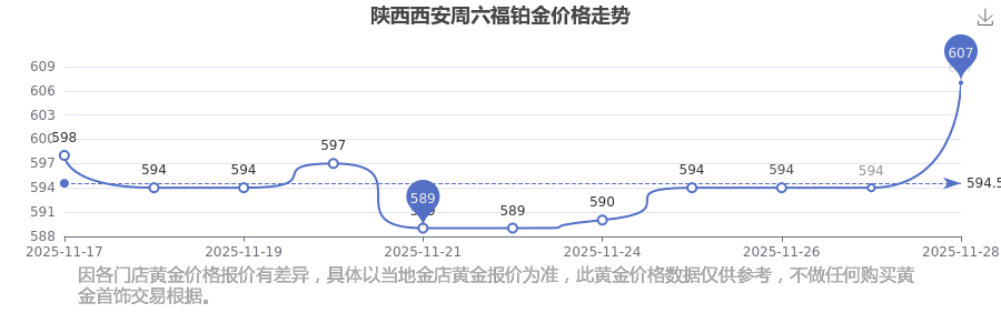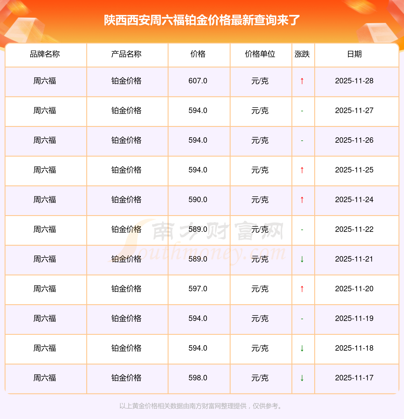陜西西安周六福鉑金價(jià)格現(xiàn)在每克多少錢?想知道今日一克黃金的出售價(jià)格是多少錢?今日陜西西安周六福鉑金價(jià)格查詢,陜西西安周六福鉑金價(jià)格在 2025年11月29日,其市場(chǎng)價(jià)格為 607.0元/克。