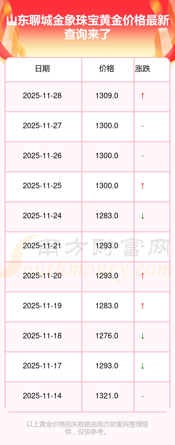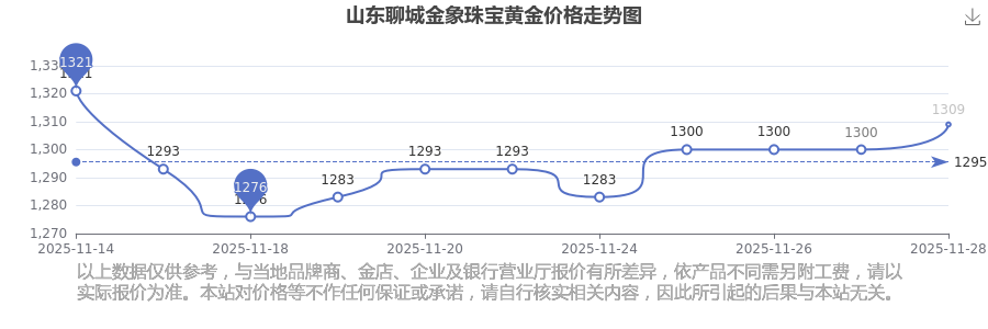 今日(2025年11月29日),山東聊城金象珠寶黃金價(jià)格的價(jià)格是1309.0元/克。