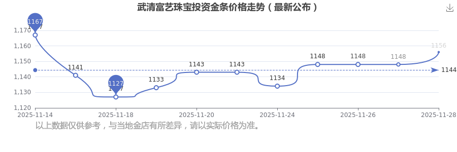 武清富藝珠寶的投資金條在今日(2025年11月29日),每克售價為1156.0元/克。